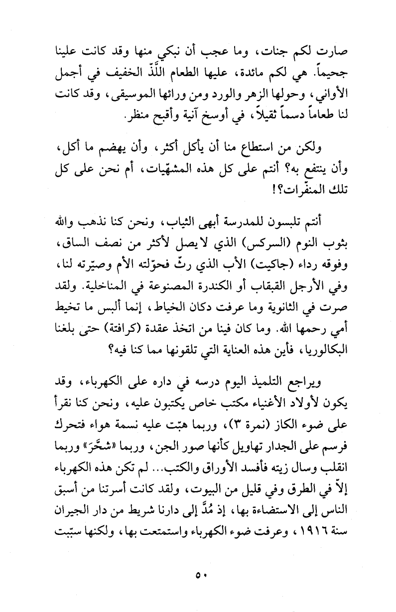 ويراجع التلميذ اليوم درسه في داره على الكهرباء، وقد يكون لأولاد الأغنياء مكتب خاص يكتبون عليه، ونحن كنا نقرأ على ضوء الكاز (نمرة 3)، وربما هبّت عليه نسمة هواء فتحرك فرسم على الجدار تهاويل كأنها صور الجن، وربما «شحَّرَ» وربما انقلب وسال زيته فأفسد الأوراق والكتب ... لم تكن هذه الكهرباء إلاّ في الطرق وفي قليل من البيوت، ولقد كانت أسرتنا من أسبق الناس إلى الاستضاءة بها، إذ مُدَّ إلى دارنا شريط من دار الجيران سنة 1916، وعرفت ضوء الكهرباء واستمتعت بها، ولكنها سبّبت