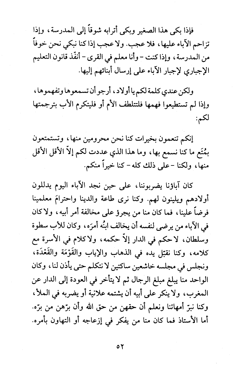 كان آباؤنا يضربوننا، على حين نجد الآباء اليوم يدللون أولادهم ويلينون لهم. وكنا نرى طاعة والدينا واحترامَ معلمينا فرضاً علينا، فما كان منا من يجرؤ على مخالفة أمر أبيه، ولا كان في الآباء من يرضى لنفسه أن يخالف ابنُه أمرَه، وكان للأب سطوة وسلطان، لا حكم في الدار إلاّ حكمه، ولا كلام في الأسرة مع كلامه، وكنا نقبّل يده في الذهاب والإياب والقَوْمَة والقَعْدَة، ونجلس في مجلسه خاشعين ساكتين لا نتكلم حتى يأذن لنا، وكان الواحد منا يبلغ مبلغ الرجال ثم لا يتأخر في العودة إلى الدار عن المغرب، ولا ينكر على أبيه أن يشتمه علانية أو يضربه في الملأ، وكنا نبرّ أمهاتنا ونعلم أن حقهن من حق الله وأن برّهن من برّه. أما الأستاذ فما كان منا من يفكر في إزعاجه أو التهاون بأمره.