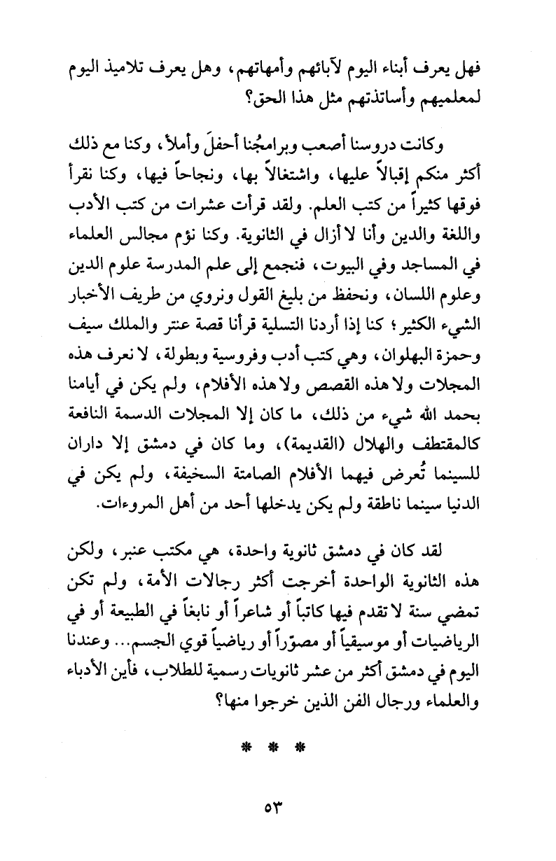 وكانت دروسنا أصعب وبرامجُنا أحفلَ وأملأ، وكنا مع ذلك أكثر منكم إقبالاً عليها، واشتغالاً بها، ونجاحاً فيها، وكنا نقرأ فوقها كثيراً من كتب العلم. ولقد قرأت عشرات من كتب الأدب واللغة والدين وأنا لا أزال في الثانوية. وكنا نؤم مجالس العلماء في المساجد وفي البيوت، فنجمع إلى علم المدرسة علوم الدين وعلوم اللسان، ونحفظ من بليغ القول ونروي من طريف الأخبار الشيء الكثير؛ كنا إذا أردنا التسلية قرأنا قصة عنتر والملك سيف وحمزة البهلوان، وهي كتب أدب وفروسية وبطولة، لا نعرف هذه المجلات ولا هذه القصص ولا هذه الأفلام، ولم يكن في أيامنا بحمد الله شيء من ذلك، ما كان إلا المجلات الدسمة النافعة كالمقتطف والهلال (القديمة)، وما كان في دمشق إلا داران للسينما تُعرض فيهما الأفلام الصامتة السخيفة، ولم يكن في الدنيا سينما ناطقة ولم يكن يدخلها أحد من أهل المروءات.