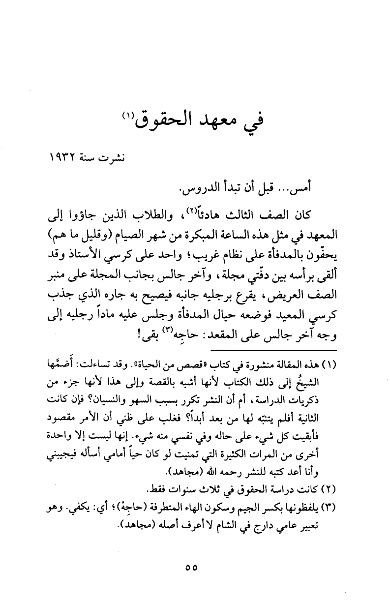 (¬1) هذه المقالة منشورة في كتاب «قصص من الحياة». وقد تساءلت: أَضمَّها الشيخُ إلى ذلك الكتاب لأنها أشبه بالقصة وإلى هذا لأنها جزء من ذكريات الدراسة، أم أن النشر تكرر بسبب السهو والنسيان؟ فإن كانت الثانية أفلم يتنبّه لها من بعد أبداً؟ فغلب على ظني أن الأمر مقصود فأبقيت كل شيء على حاله وفي نفسي منه شيء. إنها ليست إلا واحدة أخرى من المرات الكثيرة التي تمنيت لو كان حياً أمامي أسأله فيجيبني وأنا أعد كتبه للنشر رحمه الله (مجاهد).