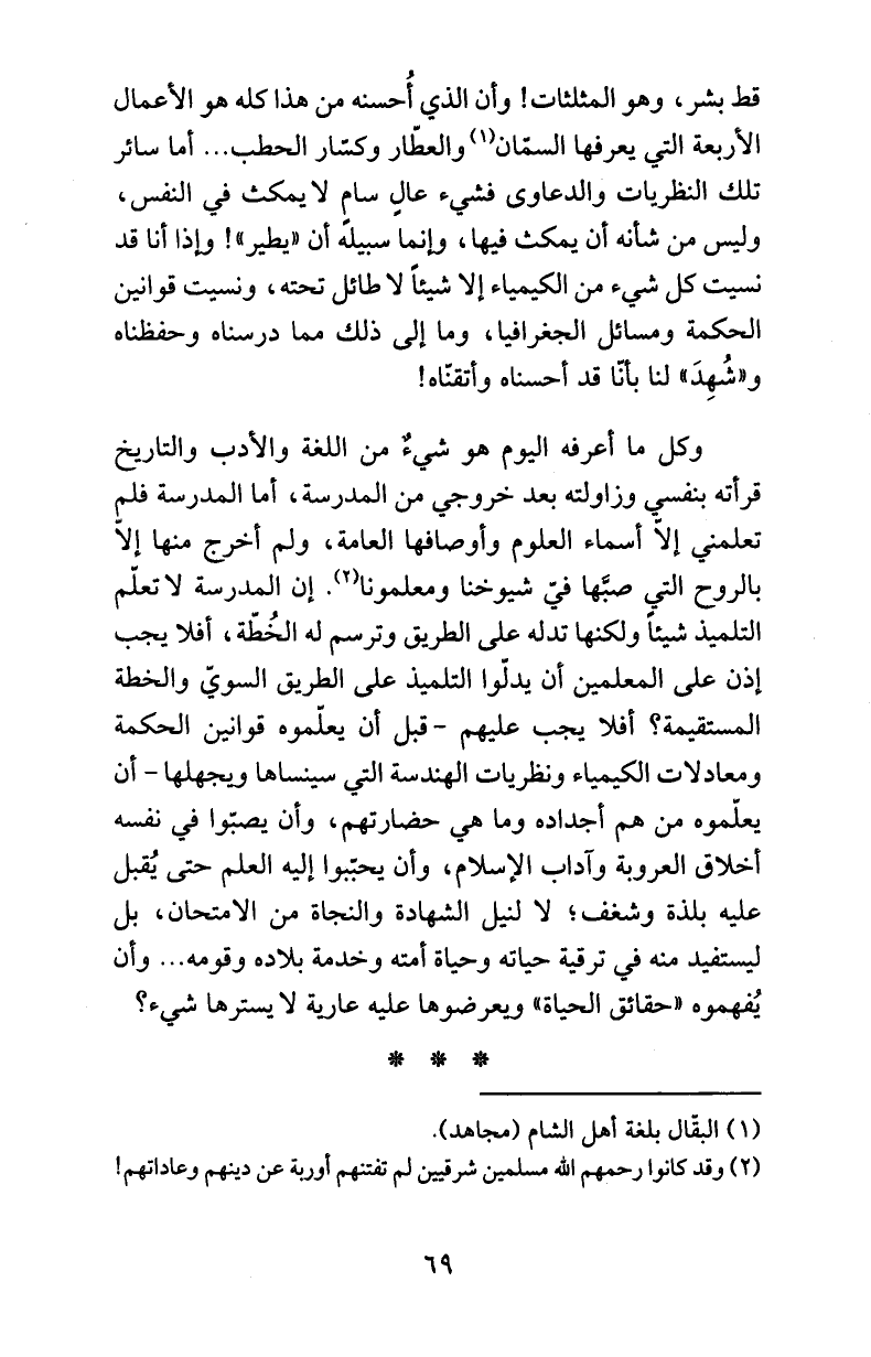 وكل ما أعرفه اليوم هو شيءٌ من اللغة والأدب والتاريخ قرأته بنفسي وزاولته بعد خروجي من المدرسة، أما المدرسة فلم تعلمني إلاّ أسماء العلوم وأوصافها العامة، ولم أخرج منها إلاّ بالروح التي صبَّها فيّ شيوخنا ومعلمونا (¬2). إن المدرسة لا تعلّم التلميذ شيئاً ولكنها تدله على الطريق وترسم له الخُطّة، أفلا يجب إذن على المعلمين أن يدلّوا التلميذ على الطريق السويّ والخطة المستقيمة؟ أفلا يجب عليهم -قبل أن يعلّموه قوانين الحكمة ومعادلات الكيمياء ونظريات الهندسة التي سينساها ويجهلها- أن يعلّموه من هم أجداده وما هي حضارتهم، وأن يصبّوا في نفسه أخلاق العروبة وآداب الإسلام، وأن يحبّبوا إليه العلم حتى يُقبل عليه بلذة وشغف؛ لا لنيل الشهادة والنجاة من الامتحان، بل ليستفيد منه في ترقية حياته وحياة أمته وخدمة بلاده وقومه ... وأن يُفهموه «حقائق الحياة» ويعرضوها عليه عارية لا يسترها شيء؟