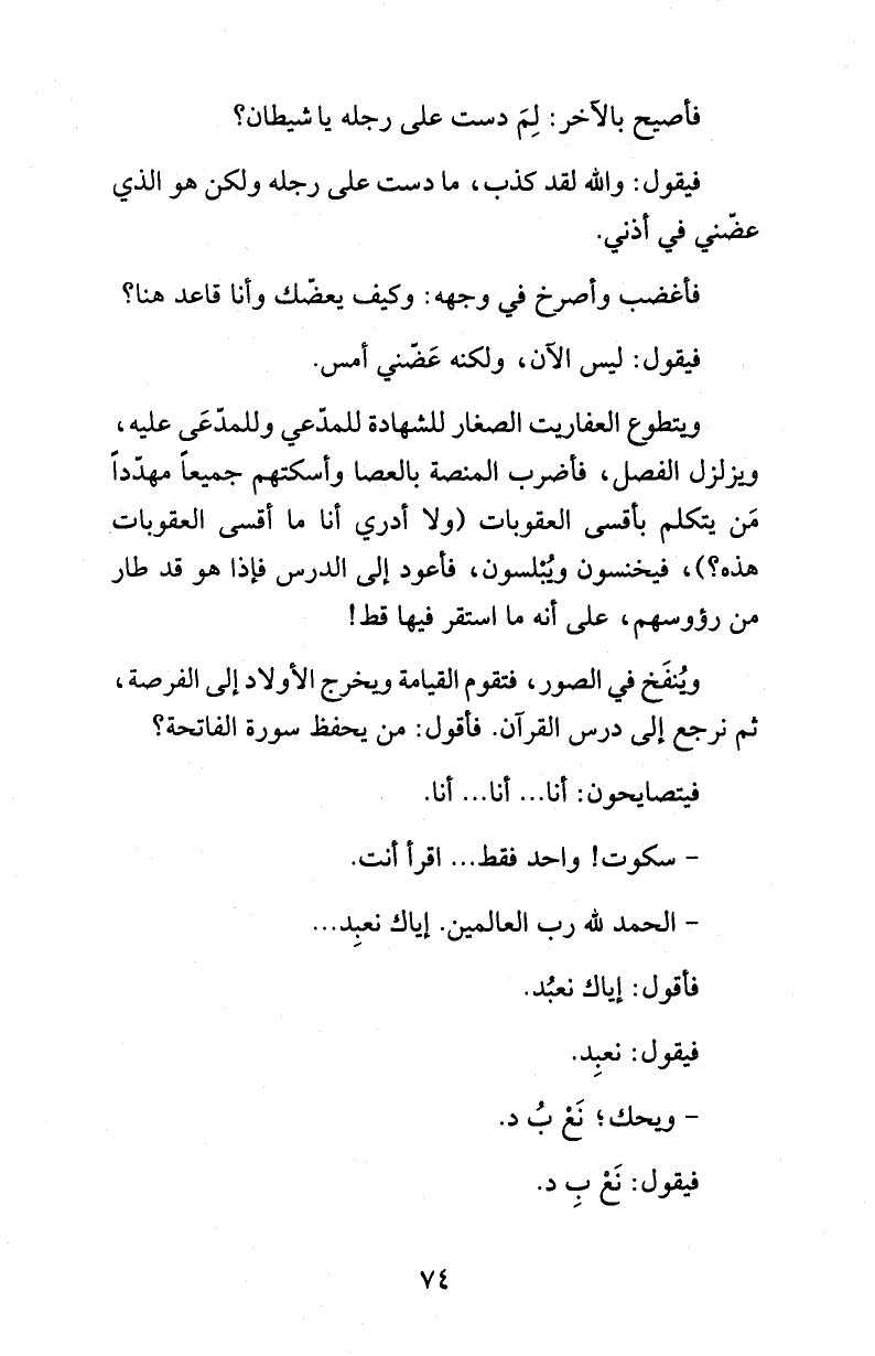 ويتطوع العفاريت الصغار للشهادة للمدّعي وللمدّعَى عليه، ويزلزل الفصل، فأضرب المنصة بالعصا وأسكتهم جميعاً مهدّداً مَن يتكلم بأقسى العقوبات (ولا أدري أنا ما أقسى العقوبات هذه؟)، فيخنسون ويُبْلسون، فأعود إلى الدرس فإذا هو قد طار من رؤوسهم، على أنه ما استقر فيها قط!