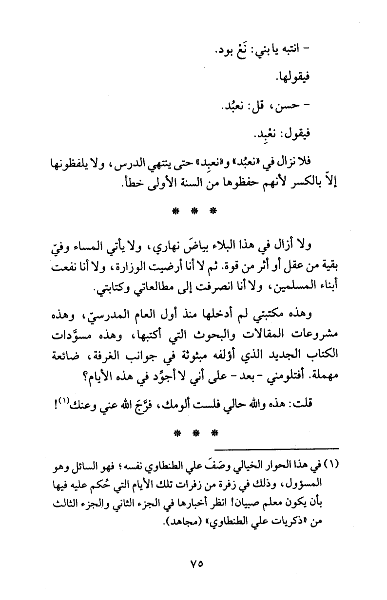 (¬1) في هذا الحوار الخيالي وصَفَ علي الطنطاوي نفسه؛ فهو السائل وهو المسؤول، وذلك في زفرة من زفرات تلك الأيام التي حُكم عليه فيها بأن يكون معلم صبيان! انظر أخبارها في الجزء الثاني والجزء الثالث من «ذكريات علي الطنطاوي» (مجاهد).