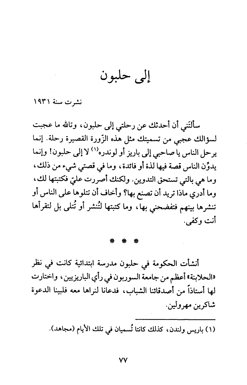 سألتَني أن أحدثك عن رحلتي إلى حلبون، وتالله ما عجبت لسؤالك عجبي من تسميتك مثل هذه الزّورة القصيرة رحلة. إنما يرحل الناس يا صاحبي إلى باريز أو لوندره (¬1) لا إلى حلبون! وإنما يدوِّن الناس قصة فيها لذة أو فائدة، وما في قصتي شيء من ذلك، وما هي بالتي تستحق التدوين. ولكنك أصررت عليّ فكتبتها لك، وما أدري ماذا تريد أن تصنع بها؟ وأخاف أن تتلوها على الناس أو تنشرها بينهم فتفضحني بها، وما كتبتها لتُنشر أو تُتلى بل لتقرأها أنت وكفى.