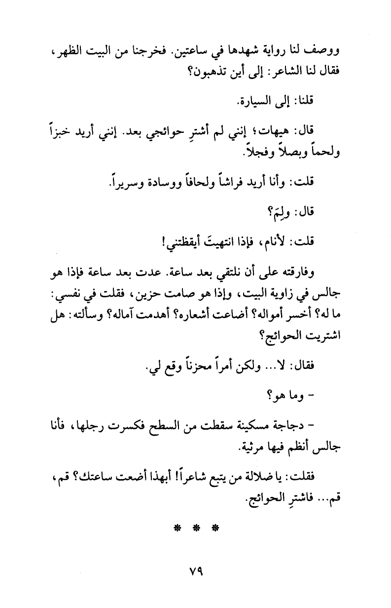فقلت: يا ضلالة من يتبع شاعراً! أبهذا أضعت ساعتك؟ قم، قم ... فاشترِ الحوائج.