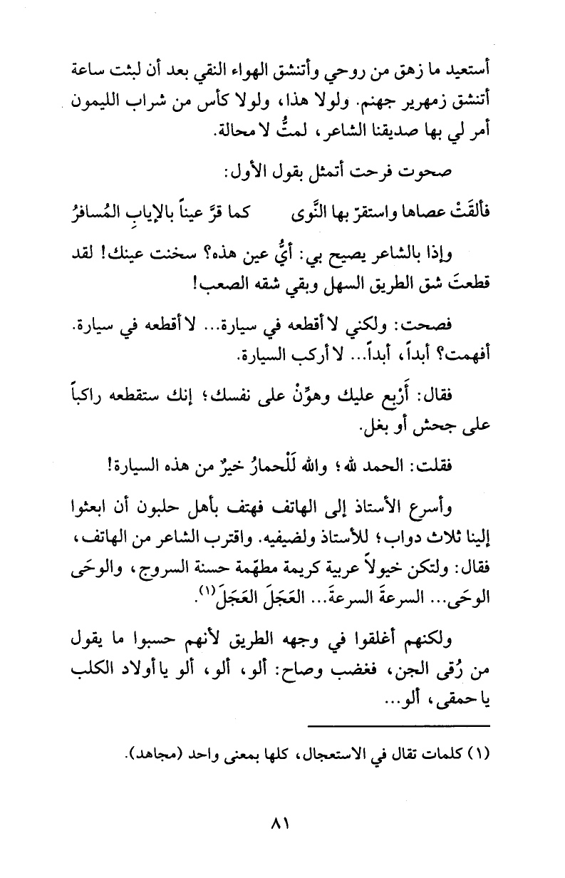 وأسرع الأستاذ إلى الهاتف فهتف بأهل حلبون أن ابعثوا إلينا ثلاث دواب؛ للأستاذ ولضيفيه. واقترب الشاعر من الهاتف، فقال: ولتكن خيولاً عربية كريمة مطهّمة حسنة السروج، والوحَى الوحَى ... السرعةَ السرعةَ ... العَجَلَ العَجَلَ (¬1).