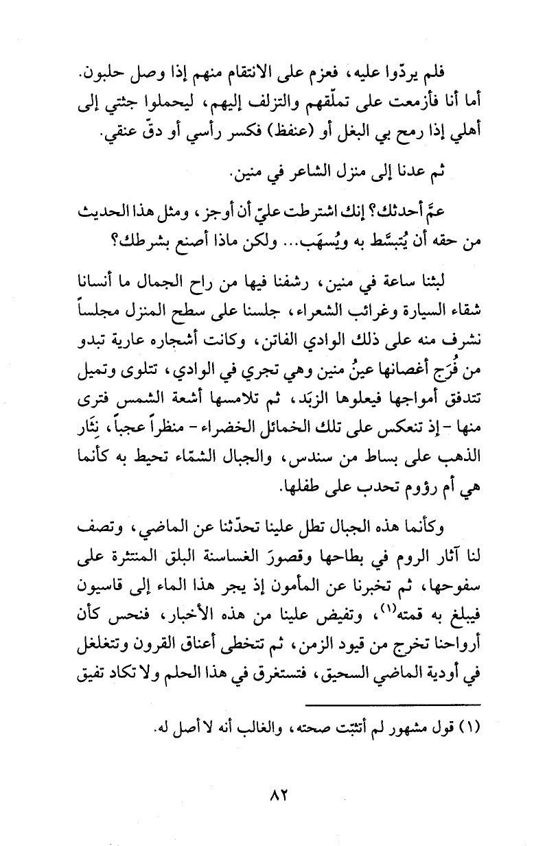 فلم يردّوا عليه، فعزم على الانتقام منهم إذا وصل حلبون. أما أنا فأزمعت على تملّقهم والتزلف إليهم، ليحملوا جثتي إلى أهلي إذا رمح بي البغل أو (عنفظ) فكسر رأسي أو دقّ عنقي.