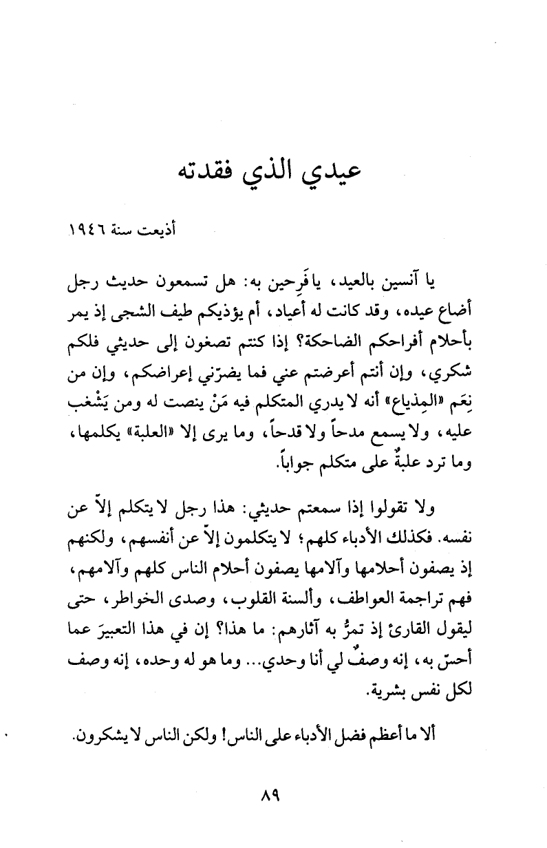 يا آنسين بالعيد، يا فَرِحين به: هل تسمعون حديث رجل أضاع عيده، وقد كانت له أعياد، أم يؤذيكم طيف الشجى إذ يمر بأحلام أفراحكم الضاحكة؟ إذا كنتم تصغون إلى حديثي فلكم شكري، وإن أنتم أعرضتم عني فما يضرّني إعراضكم، وإن من نِعَم «المِذياع» أنه لا يدري المتكلم فيه مَنْ ينصت له ومن يَشْغب عليه، ولا يسمع مدحاً ولا قدحاً، وما يرى إلا «العلبة» يكلمها، وما ترد علبةٌ على متكلم جواباً.
