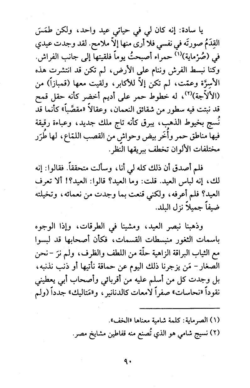 فلم أصدق أن ذلك كله لي أنا، وسألت متحققاً. فقالوا: إنه لك، إنه لباس العيد. قلت: وما العيد؟ قالوا: العيد؟! ألا تعرف العيد؟ فلم أعرفه، ولكني قنعت بما وجدت من نعمائه، وتخيلته ضيفاً جميلاً نزل البلد.