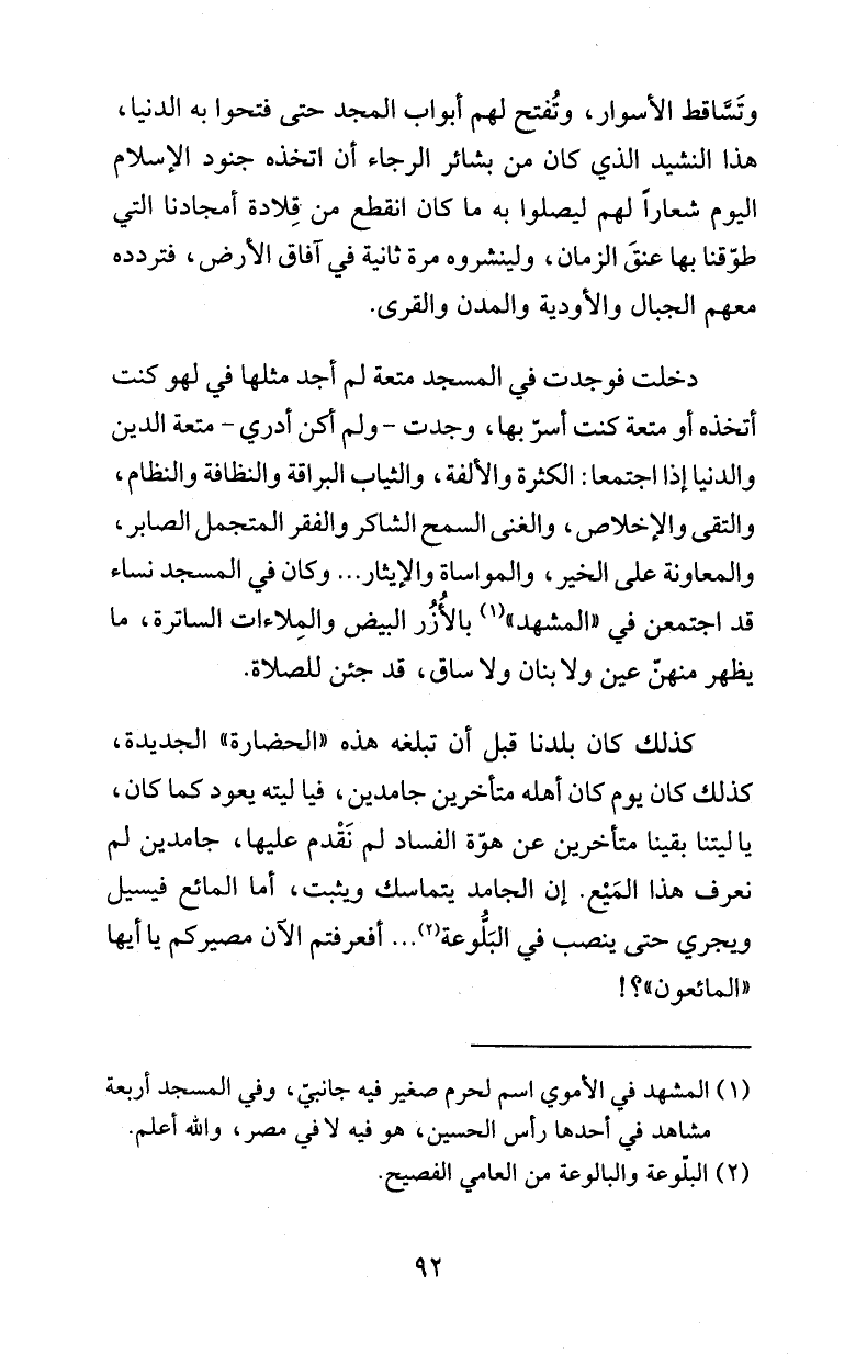 دخلت فوجدت في المسجد متعة لم أجد مثلها في لهو كنت أتخذه أو متعة كنت أسرّ بها، وجدت -ولم أكن أدري- متعة الدين والدنيا إذا اجتمعا: الكثرة والألفة، والثياب البراقة والنظافة والنظام، والتقى والإخلاص، والغنى السمح الشاكر والفقر المتجمل الصابر، والمعاونة على الخير، والمواساة والإيثار ... وكان في المسجد نساء قد اجتمعن في «المشهد» (¬1) بالأُزُر البيض والمِلاءات الساترة، ما يظهر منهنّ عين ولا بنان ولا ساق، قد جئن للصلاة.