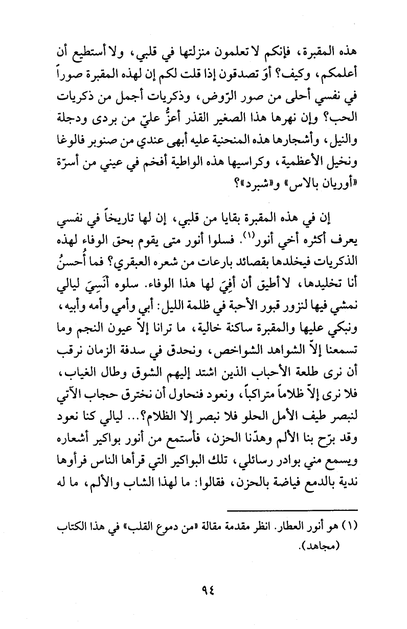 هذه المقبرة، فإنكم لا تعلمون منزلتها في قلبي، ولا أستطيع أن أعلمكم، وكيف؟ أوَ تصدقون إذا قلت لكم إن لهذه المقبرة صوراً في نفسي أحلى من صور الرّوض، وذكريات أجمل من ذكريات الحب؟ وإن نهرها هذا الصغير القذر أعزُّ عليّ من بردى ودجلة والنيل، وأشجارها هذه المنحنية عليه أبهى عندي من صنوبر فالوغا ونخيل الأعظمية، وكراسيها هذه الواطية أفخم في عيني من أسرّة «أوريان بالاس» و «شبرد»؟