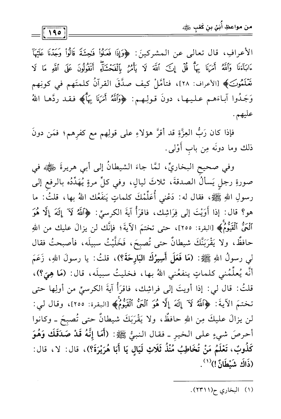 وفي صحيح البخاريِّ، لمَّا جاء الشيطان إلى أبي هريرة - رضي الله عنه - في صورة رجلٍ يسأل الصدقة، ثلاث ليالٍ، وفي كلِّ مرةٍ يُهدِّده بالرفع إلى رسول الله - صلى الله عليه وسلم -، فقال له: دعني أعلِّمك كلماتٍ ينفعك الله بها، قلت: ما هو؟ قال: إذا أويت إلى فراشك، فاقرأ آية الكرسيِّ: {اللَّهُ لَا إِلَهَ إِلَّا هُوَ الْحَيُّ الْقَيُّومُ} [البقرة: 255]، حتى تختم الآية؛ فإنَّك لن يزال عليك من الله حافظٌ، ولا يقربنَّك شيطانٌ حتى تصبح، فخلَّيت سبيله، فأصبحت فقال لي رسول الله - صلى الله عليه وسلم -: (ما فعل أسيرك البارحة؟)، قلت: يا رسول الله، زعم أنَّه يعلِّمني كلماتٍ ينفعني الله بها، فخليت سبيله، قال: (ما هي؟)، قلت: قال لي: إذا أويت إلى فراشك، فاقرأ آية الكرسيِّ من أولها حتى تختم الآية: {اللَّهُ لَا إِلَهَ إِلَّا هُوَ الْحَيُّ الْقَيُّومُ} [البقرة: 255]، وقال لي: لن يزال عليك من الله حافظٌ، ولا يقربك شيطانٌ حتى تصبح - وكانوا أحرص شيءٍ على الخير- فقال النبي - صلى الله عليه وسلم -: (أما إنَّه قد صدقك وهو كذوبٌ، تعلم من تُخاطب منذ ثلاث ليالٍ يا أبا هريرة؟)، قال: لا، قال (ذاك شيطانٌ!) (¬1).