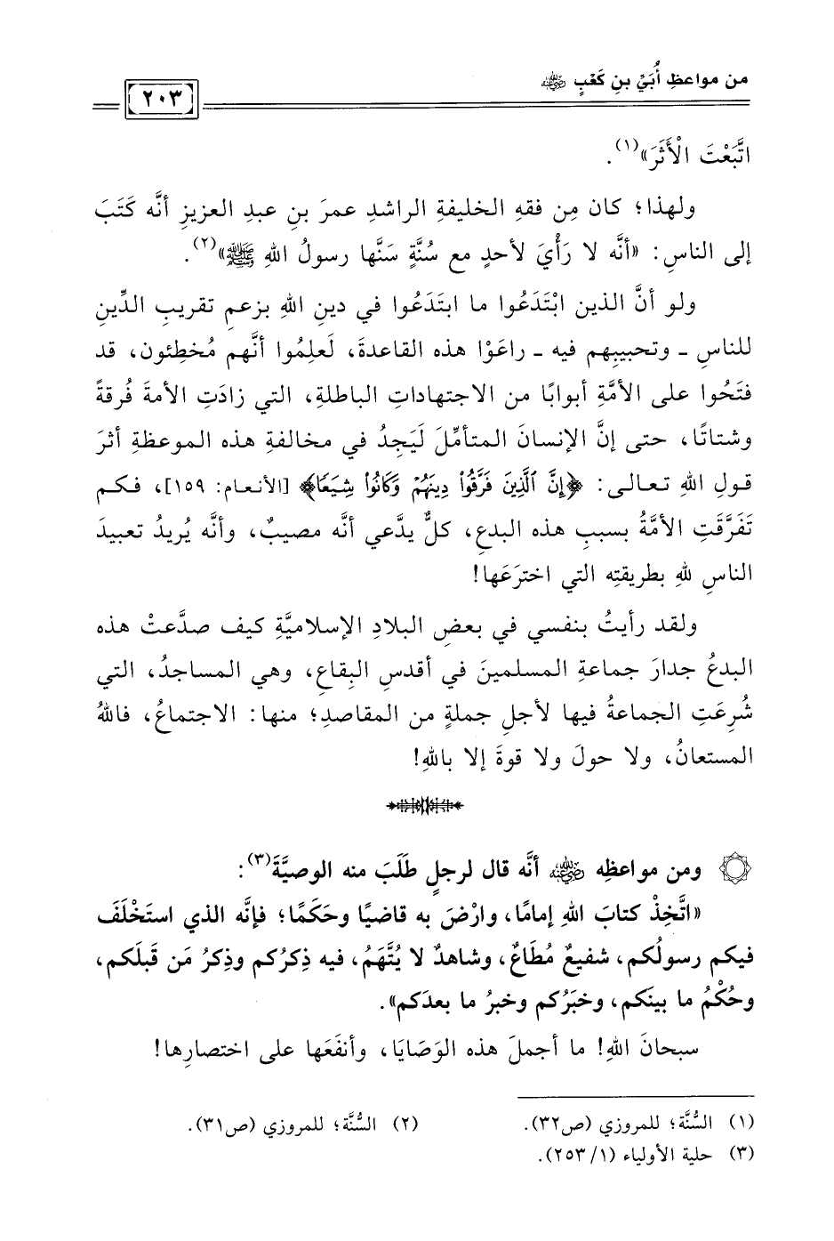 ولهذا؛ كان من فقه الخليفة الراشد عمر بن عبد العزيز أنَّه كتب إلى الناس: «أنَّه لا رأي لأحدٍ مع سُّنَّةٍ سنَّها رسول الله - صلى الله عليه وسلم -» (¬2).