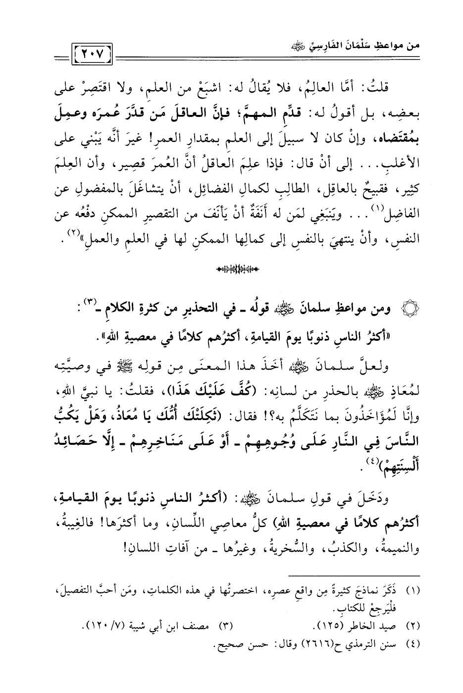 ولعلَّ سلمان - رضي الله عنه - أخذ هذا المعنى من قوله - صلى الله عليه وسلم - في وصيَّته لمعاذٍ - رضي الله عنه - بالحذر من لسانه: (كُفَّ عليك هذا)، فقلت: يا نبيَّ الله، وإنَّا لمؤاخذون بما نتكلَّم به؟! فقال: (ثكلتك أُمُّك يا معاذ، وهل يكُبُّ النَّاس في النَّار على وجوههم- أو على مناخرهم - إلَّا حصائد ألسنتهم) (¬4).
