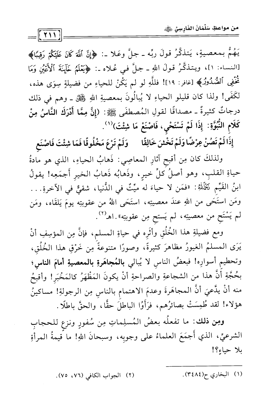 يهمُّ بمعصيةٍ، يتذكَّر قول ربِّه- جلَّ وعلا-: {إِنَّ اللَّهَ كَانَ عَلَيْكُمْ رَقِيبًا} [النساء: 1]، ويتذكَّر قول الله - جلَّ في علاه-: {يَعْلَمُ خَائِنَةَ الْأَعْيُنِ وَمَا تُخْفِي الصُّدُورُ} [غافر: 19]! فللَّه لو لم يكن للحياء من فضيلةٍ سوى هذه، لكفى! ولذا كان قليلو الحياء لا يبالون بمعصية الله - عز وجل - وهم في ذلك درجاتٌ كثيرةٌ- مصداقًا لقول المصطفى - صلى الله عليه وسلم -: (إنَّ ممَّا أدرك النَّاس من كلام النُّبوَّة: إذا لم تستحي، فاصنع ما شئت) (¬1).