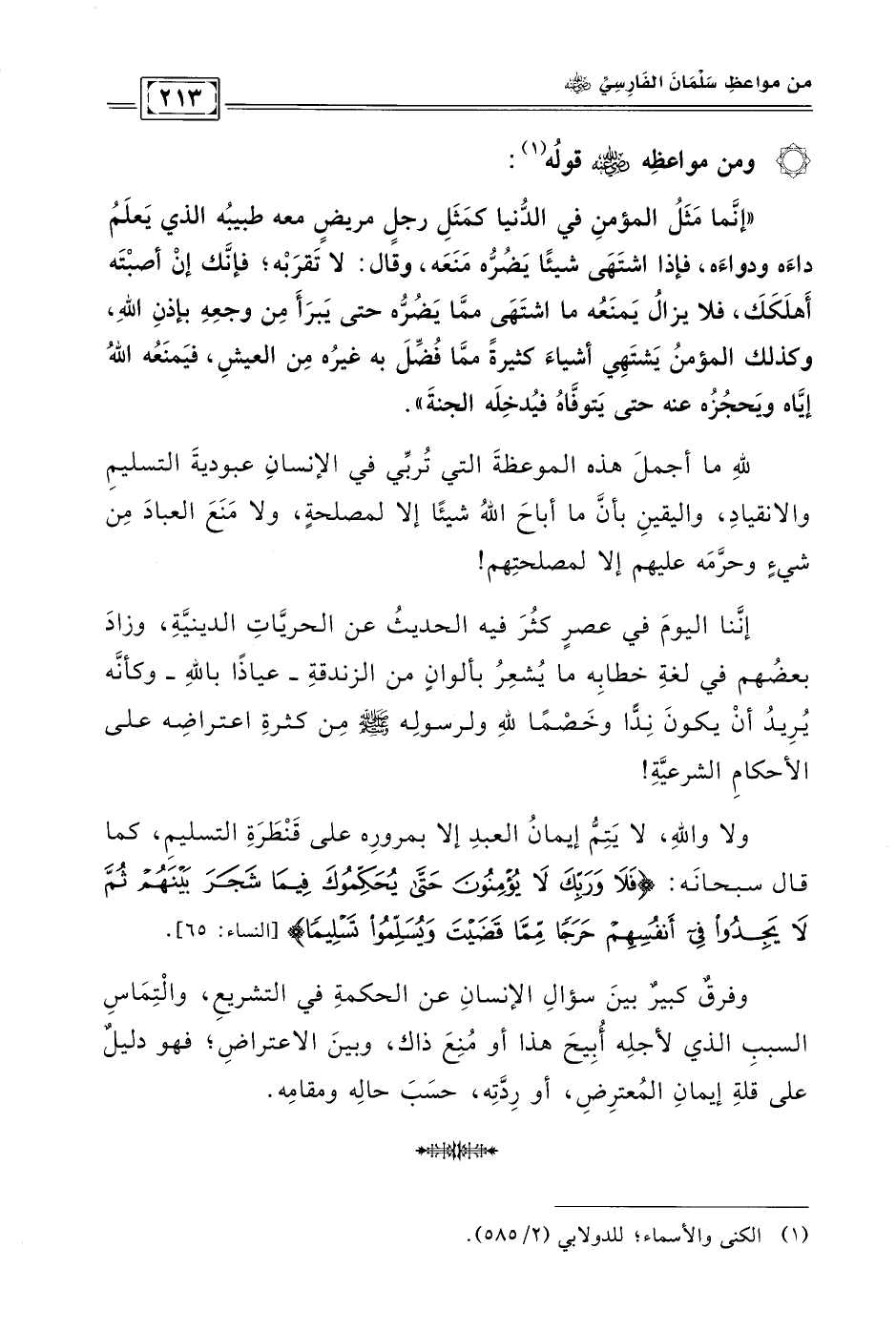 «إنَّما مثل المؤمن في الدُّنيا كمثل رجلٍ مريضٍ معه طبيبه الذي يعلم داءه ودواءه، فإذا اشتهى شيئًا يضرُّه منعه، وقال: لا تقربه؛ فإنَّك إن أصبته أهلكك، فلا يزال يمنعه ما اشتهى ممَّا يضرُّه حتى يبرأ من وجعه بإذن الله، وكذلك المؤمن يشتهي أشياء كثيرةً ممَّا فضِّل به غيره من العيش، فيمنعه الله إيَّاه ويحجزه عنه حتى يتوفَّاه فيدخله الجنة».