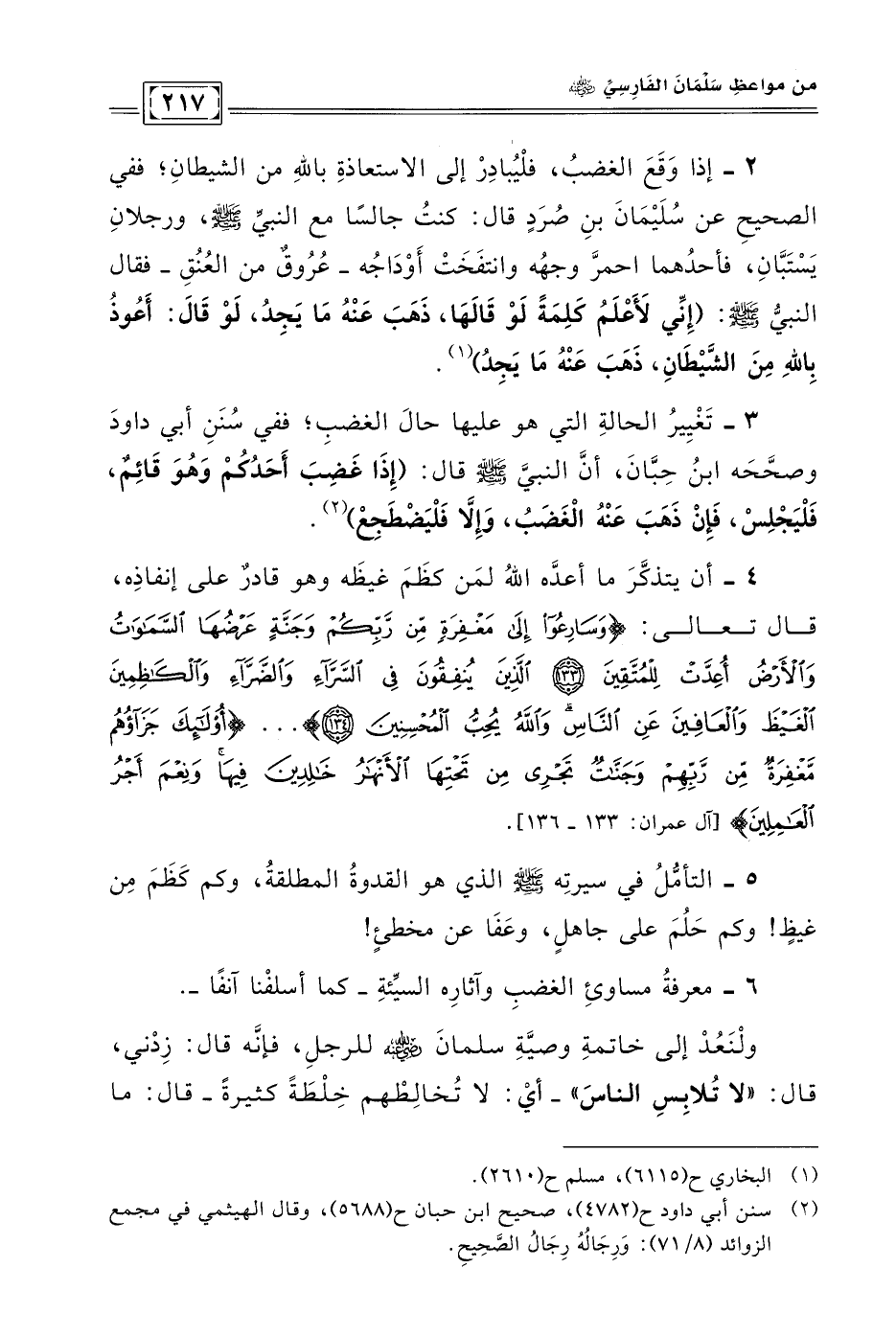 4 - أن يتذكَّر ما أعدَّه الله لمن كظم غيظه وهو قادرٌ على إنفاذه، قال تعالى: {وَسَارِعُوا إِلَى مَغْفِرَةٍ مِنْ رَبِّكُمْ وَجَنَّةٍ عَرْضُهَا السَّمَاوَاتُ وَالْأَرْضُ أُعِدَّتْ لِلْمُتَّقِينَ * الَّذِينَ يُنْفِقُونَ فِي السَّرَّاءِ وَالضَّرَّاءِ وَالْكَاظِمِينَ الْغَيْظَ وَالْعَافِينَ عَنِ النَّاسِ وَاللَّهُ يُحِبُّ الْمُحْسِنِينَ} ... {أُولَئِكَ جَزَاؤُهُمْ مَغْفِرَةٌ مِنْ رَبِّهِمْ وَجَنَّاتٌ تَجْرِي مِنْ تَحْتِهَا الْأَنْهَارُ خَالِدِينَ فِيهَا وَنِعْمَ أَجْرُ الْعَامِلِينَ} [آل عمران: 133 - 136]. 5 - التأمُّل في سيرته - صلى الله عليه وسلم - الذي هو القدوة المطلقة، وكم كظم من غيظٍ! وكم حَلُمَ على جاهلٍ، وعفا عن مخطئٍ! 6 - معرفة مساوئ الغضب وآثاره السيِّئة- كما أسلفنا آنفًا .. ولنعد إلى خاتمة وصيَّة سلمان - رضي الله عنه - للرجل، فإنَّه قال: زدني، قال: «لا تلابس الناس» - أي: لا تخالطهم خلطةً كثيرةً - قال: ما