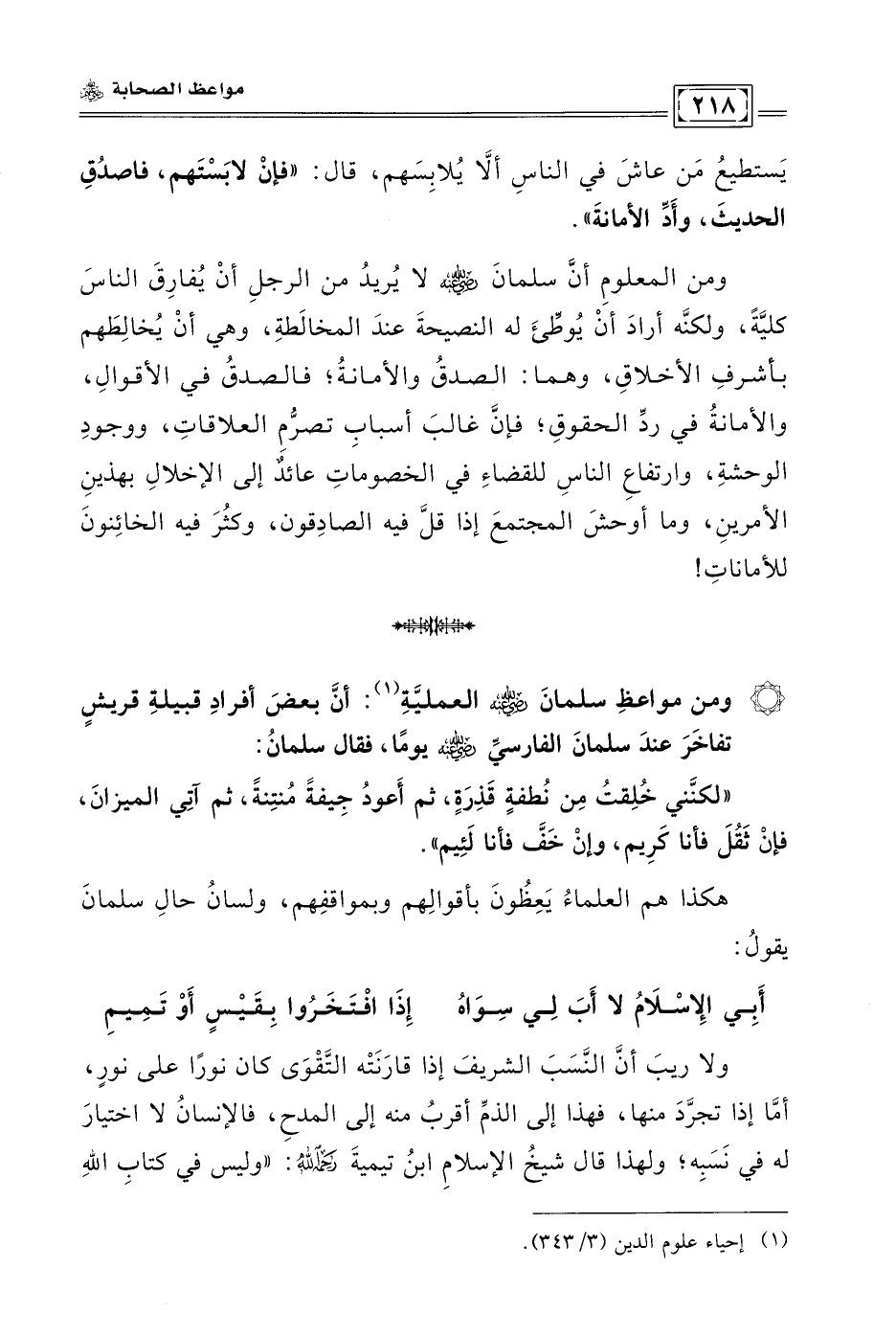 • ومن مواعظ سلمان - رضي الله عنه - العمليَّة (¬1): أنَّ بعض أفراد قبلية قريشٍ تفاخر عند سلمان الفارسيِّ - رضي الله عنه - يومًا، فقال سلمان: