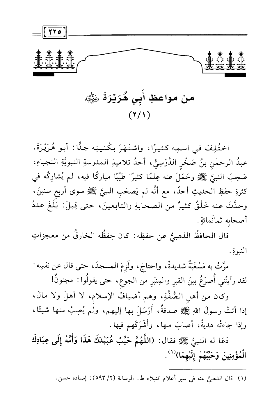 اختُلِف في اسمه كثيرًا، واشتهر بكُنيته جدًّا، أبو هريرة، عبد الرحمن بن صخرٍ الدَّوسيُّ، أحد تلاميذ المدرسة النبويَّة النجباء، صحب النبيَّ - صلى الله عليه وسلم - وحمل عنه علمًا كثيرًا طيِّبًا مباركًا فيه، لم يشاركه في كثرة حفظ الحديث أحدٌ، مع أنَّه لم يصحب النبيَّ - صلى الله عليه وسلم - سوى أربع سنين، وحدَّث عنه خلقٌ كثيرٌ من الصحابة والتابعين، حتى قيل: بلغ عدد أصحابه ثمانمائةٍ.
