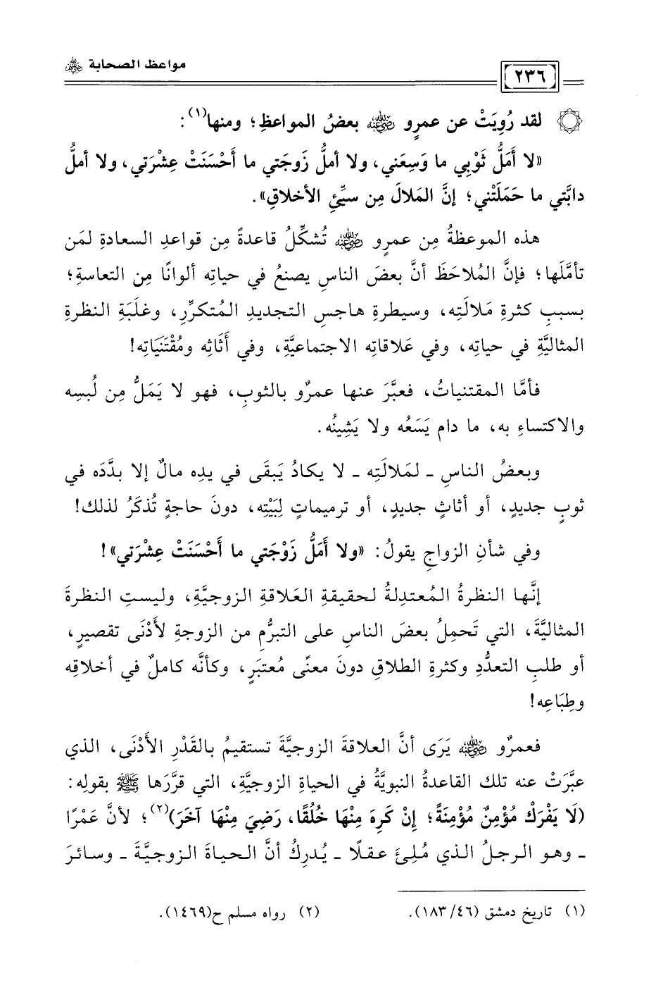 فعمرٌو - رضي الله عنه - يرى أنَّ العلاقة الزوجيَّة تستقيم بالقدر الأدنى، الذي عبَّرت عنه تلك القاعدة النبويَّة في الحياة الزوجيَّة، التي قرَّرها - صلى الله عليه وسلم - بقوله: (لا يفرك مؤمنٌ مؤمنةً؛ إن كره منها خلقًا، رضي منها آخر) (¬2)؛ لأنَّ عمرًا - وهو الرجل الذي مُلئ عقلًا - يُدرك أنَّ الحياة الزوجيَّة - وسائر