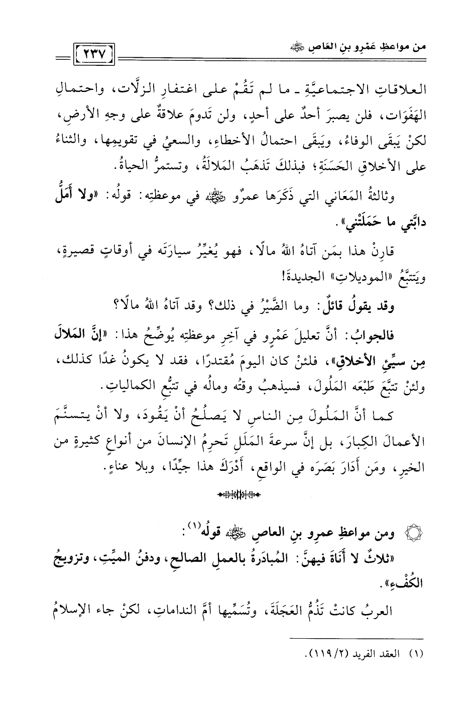 فالجواب: أنَّ تعليل عمرٍو في آخر موعظته يوضِّح هذا: «إنَّ الملال من سيِّاء الأخلاق»، فلئن كان اليوم مقتدرًا، فقد لا يكون غدًا كذلك، ولئن تتبَّع طبعه الملول، فسيذهب وقته وماله في تتبُّع الكماليات.