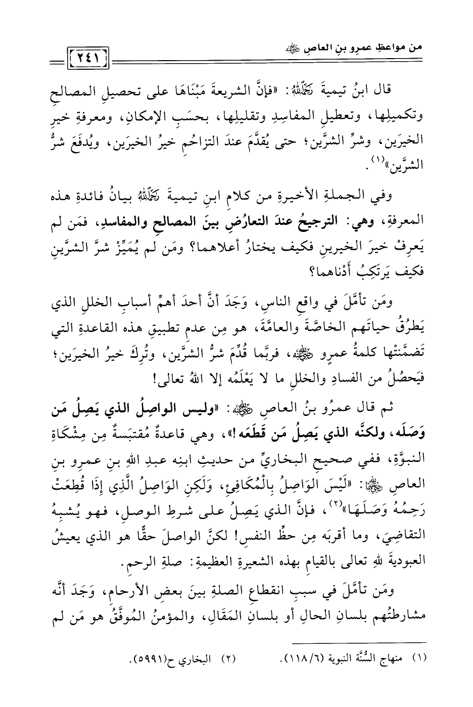 ثم قال عمرو بن العاص - رضي الله عنه -: «وليس الواصل الذي يصل من وصله، ولكنَّه الذي يصل من قطعه!»، وهي قاعدةٌ مقتبسةٌ من مشكاة النبوَّة، ففي صحيح البخاريِّ من حديث ابنه عبد الله بن عمرو بن رحمه وصلها» (¬2)، فإنَّ الذي يصل على شرط الوصل، فهو يشبه التقاضي، وما أقربه من حظِّ النفس! لكنَّ الواصل حقًّا هو الذي يعيش العبودية لله تعالى بالقيام بهذه الشعيرة العظيمة: صلة الرحم.