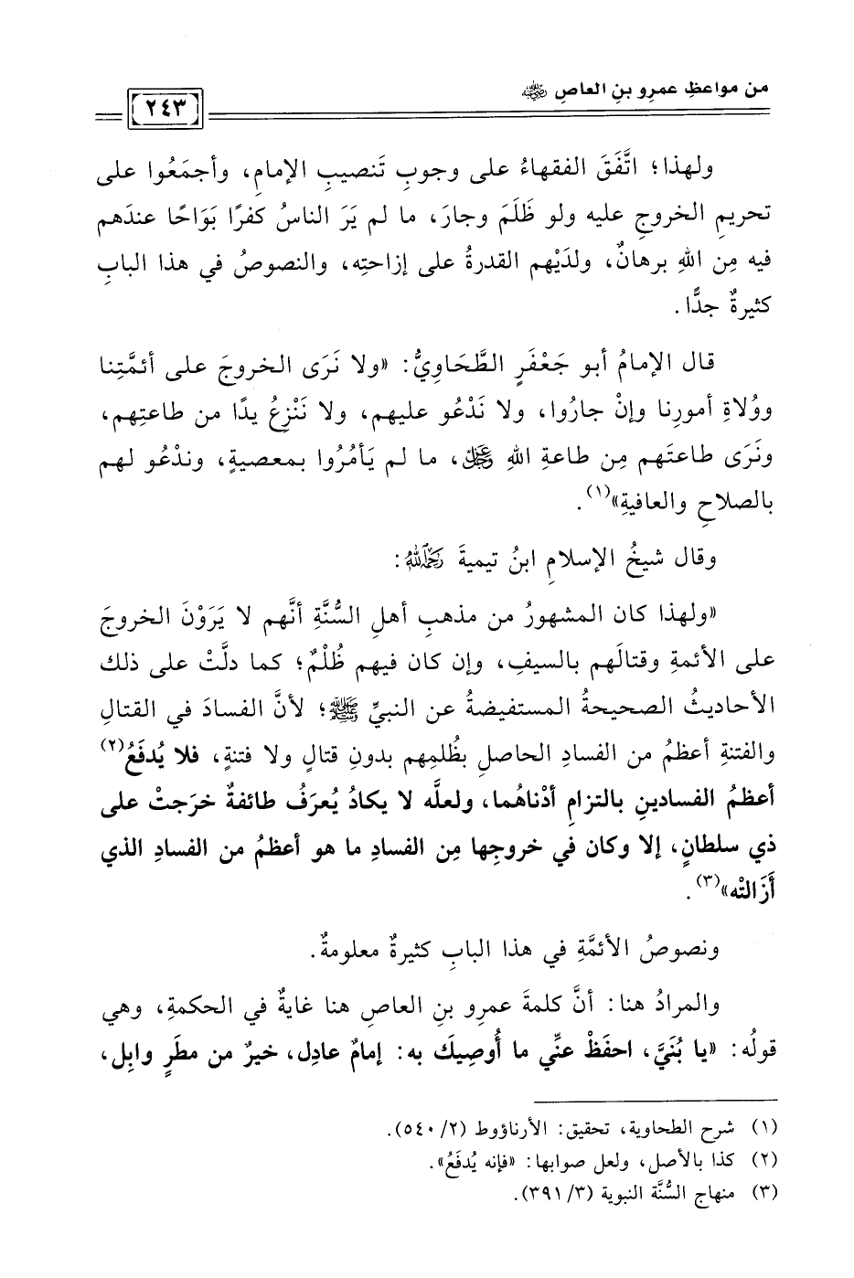 والمراد هنا: أنَّ كلمة عمرو بن العاص هنا غايةٌ في الحكمة، وهي قوله: «يا بُنيَّ، احفظ عنِّي ما أوصيك به: إمامٌ عادل، خيرٌ من مطرٍ وابل،