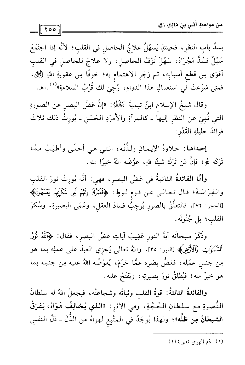 وقال شيخ الإسلام ابن تيمية رحمه الله: «إنَّ غضَّ البصر عن الصورة التي نُهي عن النظر إليها - كالمرأة والأمرد الحسن- يورث ذلك ثلاث فوائد جليلة القدر: