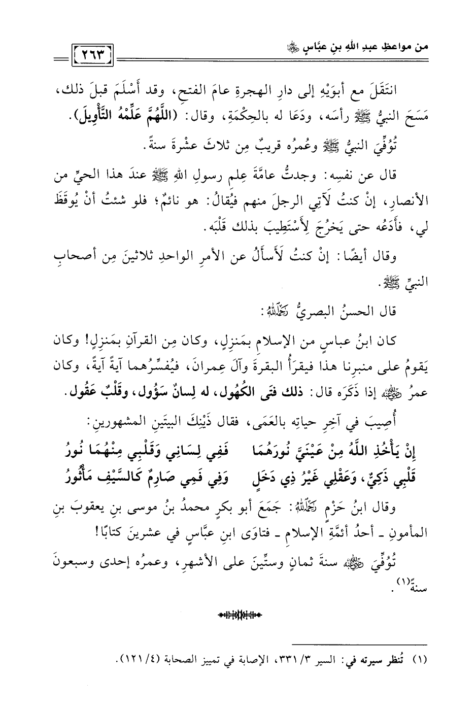كان ابن عباس من الإسلام بمنزلٍ، وكان من القرآن بمنزلٍ! وكان يقوم على منبرنا هذا فيقرأ البقرة وآل عمران، فيفسِّرهما آيةً آيةً، وكان عمر - رضي الله عنه - إذا ذكره قال: ذلك فتى الكهول، له لسانٌ سؤول، وقلبٌ عقول.