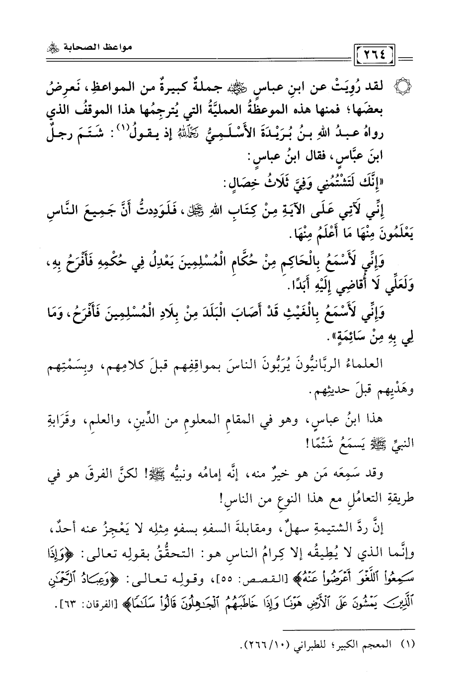 • لقد رويت عن ابن عباسٍ - رضي الله عنه - جملةٌ كبيرةٌ من المواعظ، نعرض بعضها؛ فمنها هذه الموعظة العمليَّة التي يترجمها هذا الموقف الذي رواه عبد الله بن بريدة الأسلميُّ رحمه الله إذ يقول (¬1): شتم رجلٌ ابن عبَّاسٍ، فقال ابن عباسٍ: «إنَّك لتشتُمُني وفيَّ ثلاث خصالٍ: