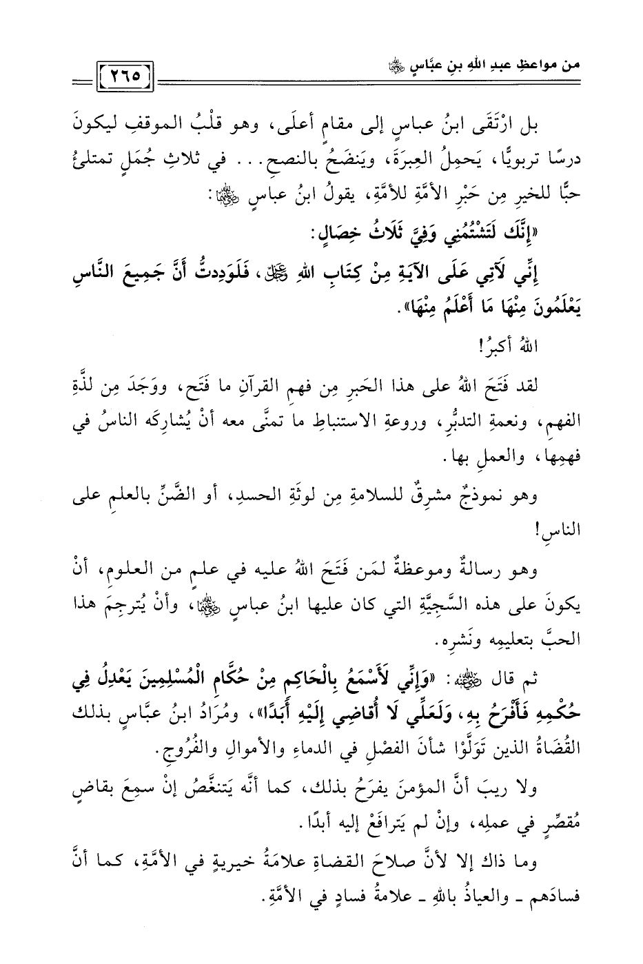 بل ارتقى ابن عباسٍ إلى مقام أعلى، وهو قلب الموقف ليكون درسًا تربويًّا، يحمل العبرة، ويَنضَحُ بالنصح ... في ثلاث جُملٍ تمتلئ حبًّا للخير من حبر الأمَّة للأمَّة، يقول ابن عباسٍ رضي الله عنهما: