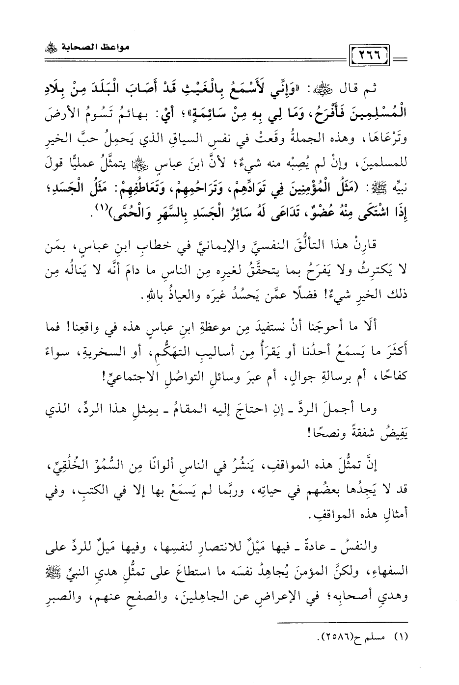ثم قال - رضي الله عنه -: «وإنِّي لأسمع بالغيث قد أصاب البلد من بلاد المسلمين فأفرح، وما لي به من سائمةٍ»؛ أي: بهائم تسوم الأرض وترعاها، وهذه الجملة وقعت في نفس السياق الذي يحمل حبَّ الخير للمسلمين، وإن لم يصبه منه شيءٌ؛ لأنَّ ابن عباس رضي الله عنهما يتمثَّل عمليًّا قول نبيِّه - صلى الله عليه وسلم -: (مثل المؤمنين في توادِّهم، وتراحمهم، وتعاطفهم: مثل الجسد؛ إذا اشتكى منه عضوٌ، تداعى له سائر الجسد بالسَّهر والحُمَّى) (¬1).