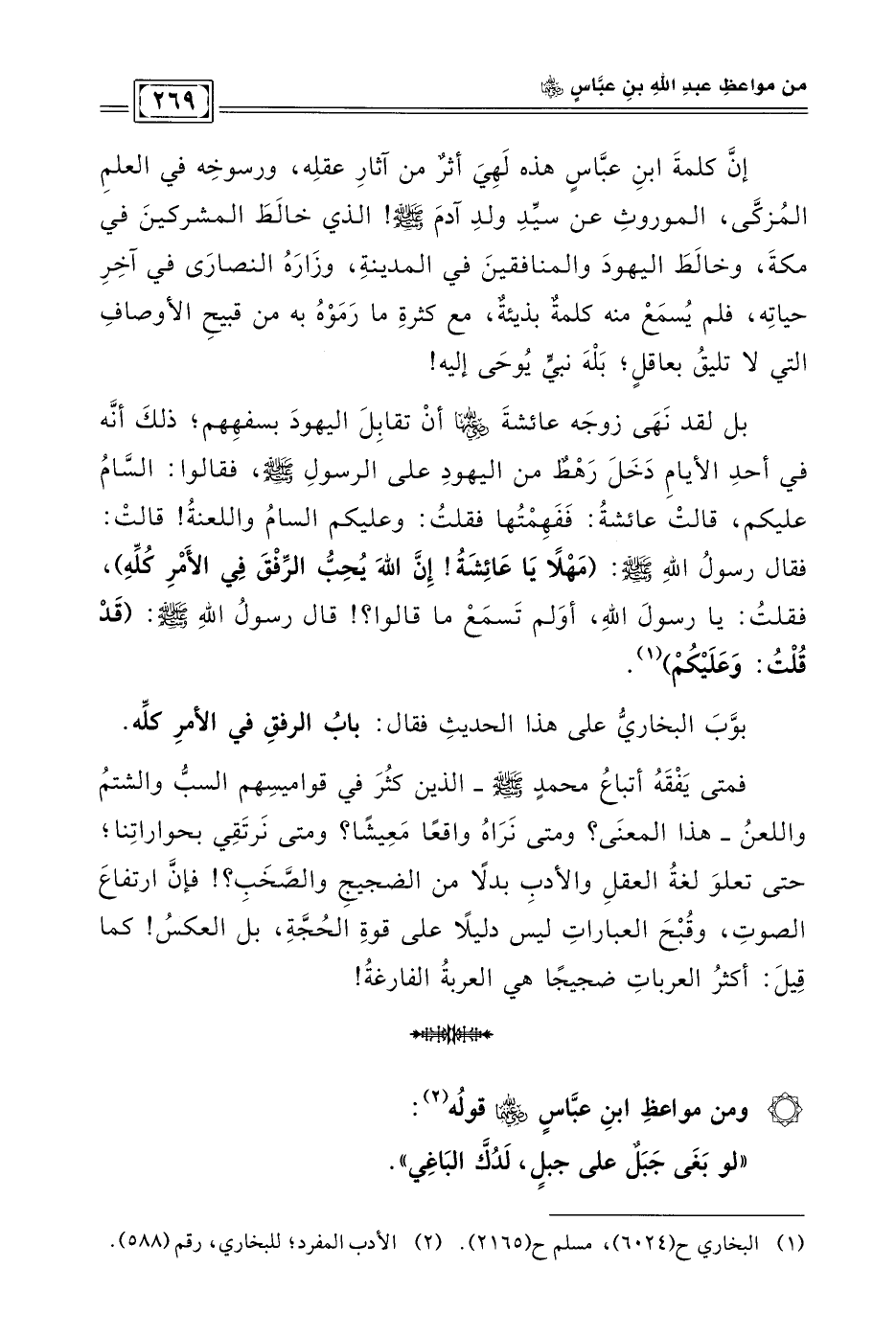 إنَّ كلمة ابن عبَّاسٍ هذه لَهِيَ أثرٌ من آثار عقله، ورسوخه في العلم المزكَّى، الموروث عن سيِّد ولد آدم - صلى الله عليه وسلم -! الذي خالط المشركين في مكة، وخالط اليهود والمنافقين في المدينة، وزارة النصارى في آخر حياته، فلم يسمع منه كلمةٌ بذيئةٌ، مع كثرة ما رموه به من قبيح الأوصاف التي لا تليق بعاقلٍ؛ بَلْهَ نبيٍّ يُوحى إليه!