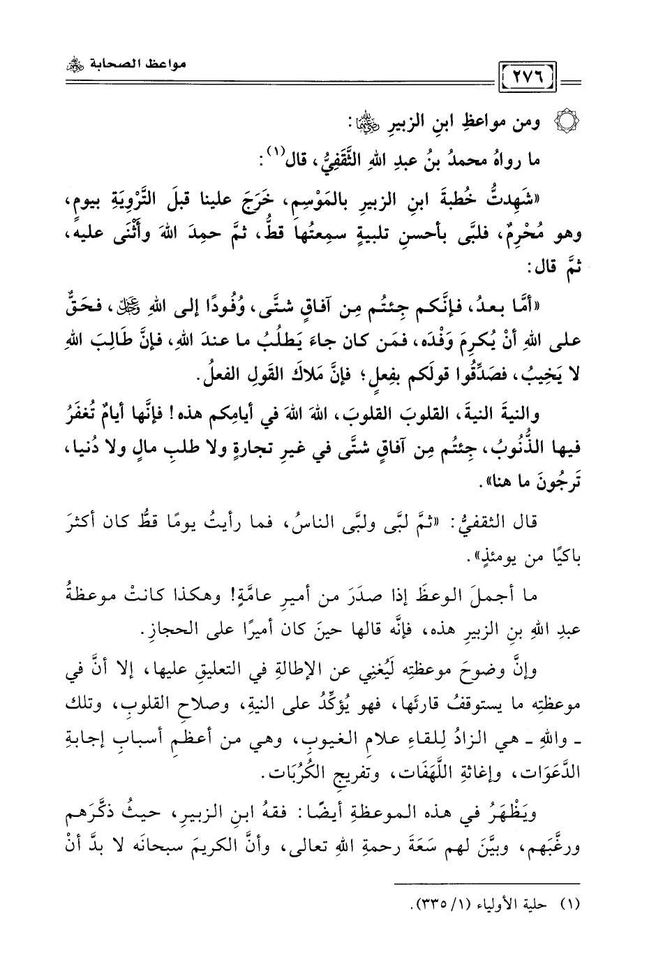 ما أجمل الوعظ إذا صدر من أمير عامَّةٍ! وهكذا كانت موعظة عبد الله بن الزبير هذه، فإنَّه قالها حين كان أميرًا على الحجاز.
