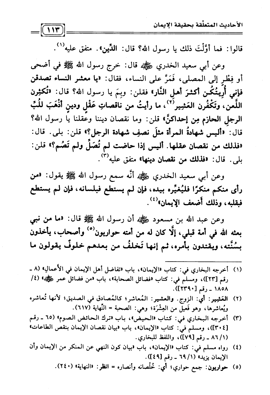 وعن أبي سعيد الخدري - رضي الله عنه - قال: خرج رسول الله - صلى الله عليه وسلم - في أضحى، أو فِطْرٍ إلى المصلى فَمَرَّ على النساء، فقال: (يا معشر النساء تصدقن فإني أُرِيتُكُن أكثرَ أهلِ النَّار) فقلن: وبِمَ يا رسول الله؟ قال: (تُكثِرن اللَّعن، وتَكْفُرن العَشِير (¬٢) ما رأيتُ من ناقصاتِ عَقْلٍ، ودينٍ أذْهَبَ للُبِّ الرجلِ الحازم مِن إحداكنّ) قلن: وما نقصان ديننا وعقلنا يا رسول الله؟ قال: (أليس شهادةُ المرأة مثل نصف شهادة الرجل؟) قلن: بلى. قال: (فذلك من نقصان عقلها. أليس إذا حاضت لم تُصَلِّ ولم تَصُم؟) قلن: بلى. قال: (فذلك من نقصان دينها) متفق عليه (¬٣) .