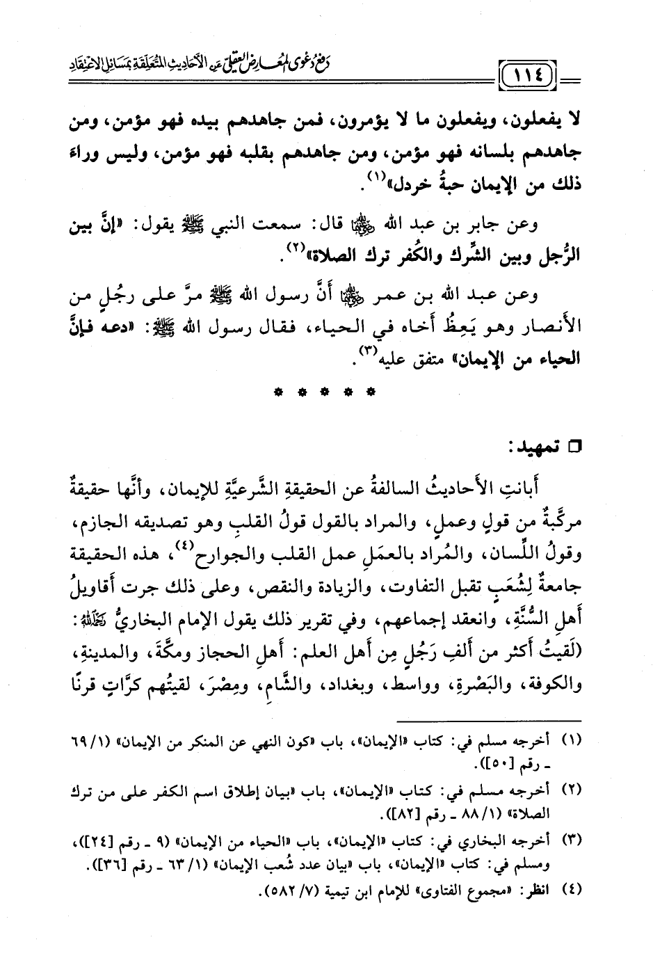 أَبانتِ الأَحاديثُ السالفةُ عن الحقيقةِ الشَّرعيَّةِ للإيمان، وأنّها حقيقةٌ مركَّبةٌ من قولٍ وعملٍ، والمراد بالقول قولُ القلبِ وهو تصديقه الجازم، وقولُ اللّسان، والمُراد بالعمَلِ عمل القلب والجوارح (¬٥)،هذه الحقيقة جامعةٌ لِشُعَبٍ تقبل التفاوت، والزيادة والنقص، وعلى ذلك جرت أَقاويلُ أَهلِ السُّنَّةِ، وانعقد إجماعهم، وفي تقرير ذلك يقول الإمام البخاريُّ -رحمه الله-: (لَقيتُ أَكثر من أَلفِ رَجُلٍ مِن أَهل العلم: أَهلِ الحجاز ومكّةَ، والمدينةِ، والكوفة، والبصْرةِ، وواسط، وبغداد، والشَّامِ، ومِصْرَ، لقيتُهم كرَّاتٍ قرنًا