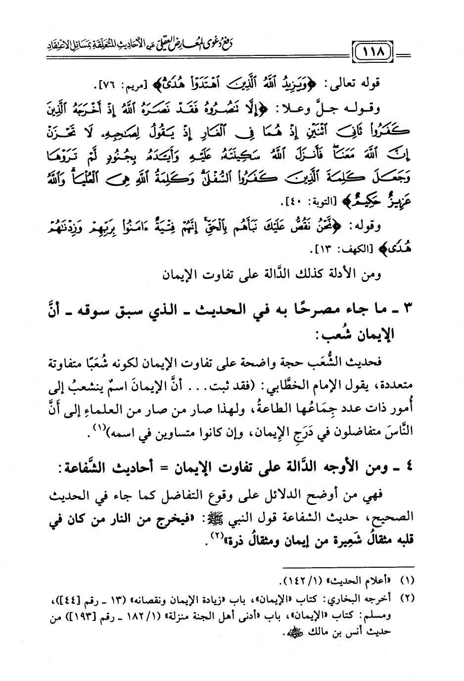 فحديث الشُّعَب حجة واضحة على تفاوت الإيمان لكونه شُعَبًا متفاوتة متعددة، يقول الإمام الخطّابي: (فقد ثبت ... أنَّ الإيمانَ اسمٌ ينشعبُ إلى أُمور ذات عدد جِمَاعُها الطاعةُ، ولهذا صار من صار من العلماءِ إلى أَنَّ النَّاسَ متفاضلون في دَرَجِ الإِيمان، وإن كانوا متساوين في اسمه) (¬١)