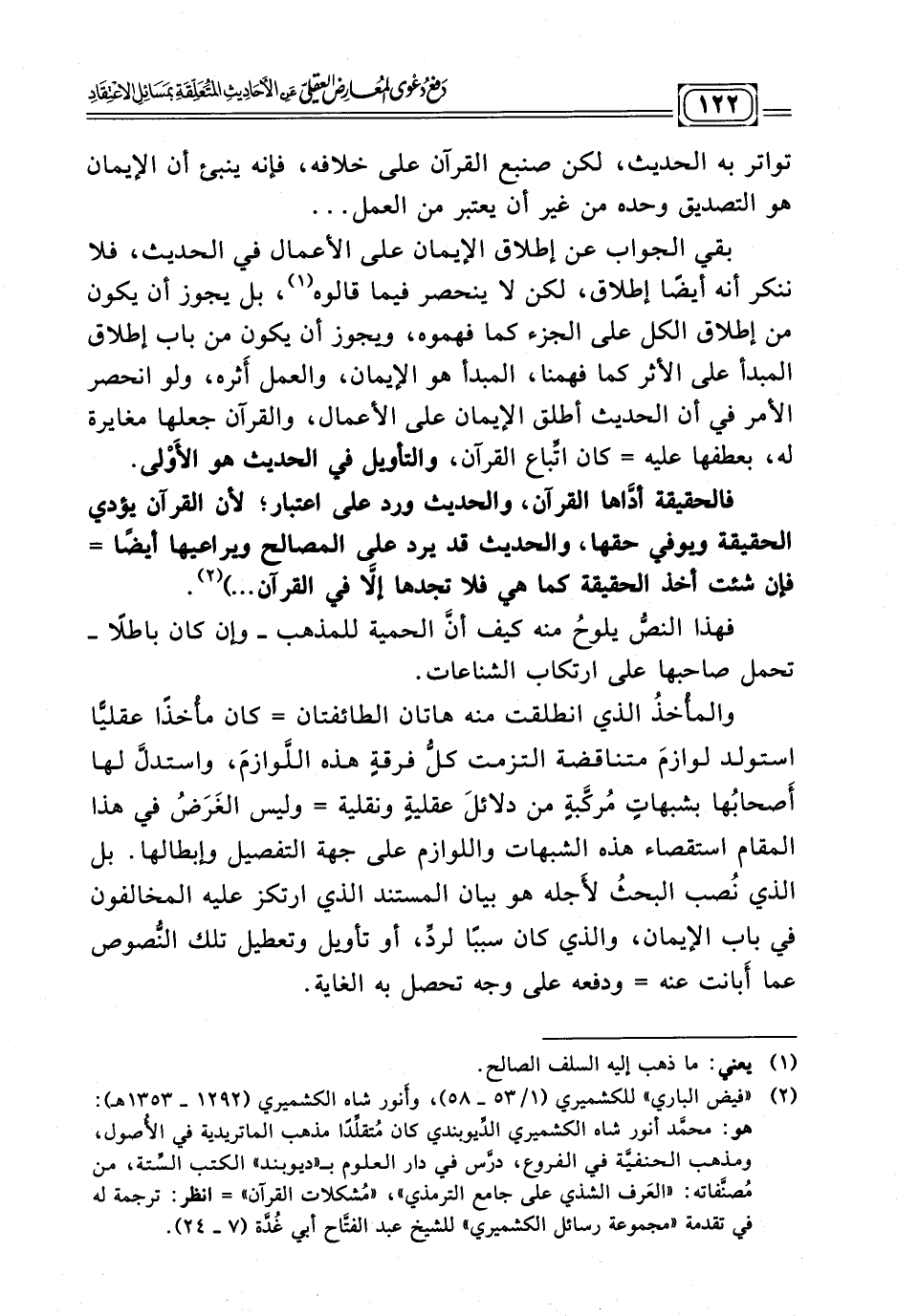(¬٢) "فيض الباري"للكشميري (١/ ٥٣ - ٥٨) وأَنور شاه الكشميري (١٢٩٢ - ١٣٥٣ هـ):هو محمَّد أنور شاه الكشميري الدِّيوبندي كان مُتقلِّدًا مذهب الماتريدية في الأُصول، ولمذهب الحنفيَّة في الفروع، درَّس في دار العلوم بـ"ديوبند" الكتب السِّتة، من مُصنَّفاته: "العَرف الشذي على جامع الترمذي "،"مُشكلات القرآن"=انظر: ترجمة له في تقدمة "مجموعة رسائل الكشميري" للشيخ عبدالفتَّاح أبي غُدَّة (٧ - ٢٤)