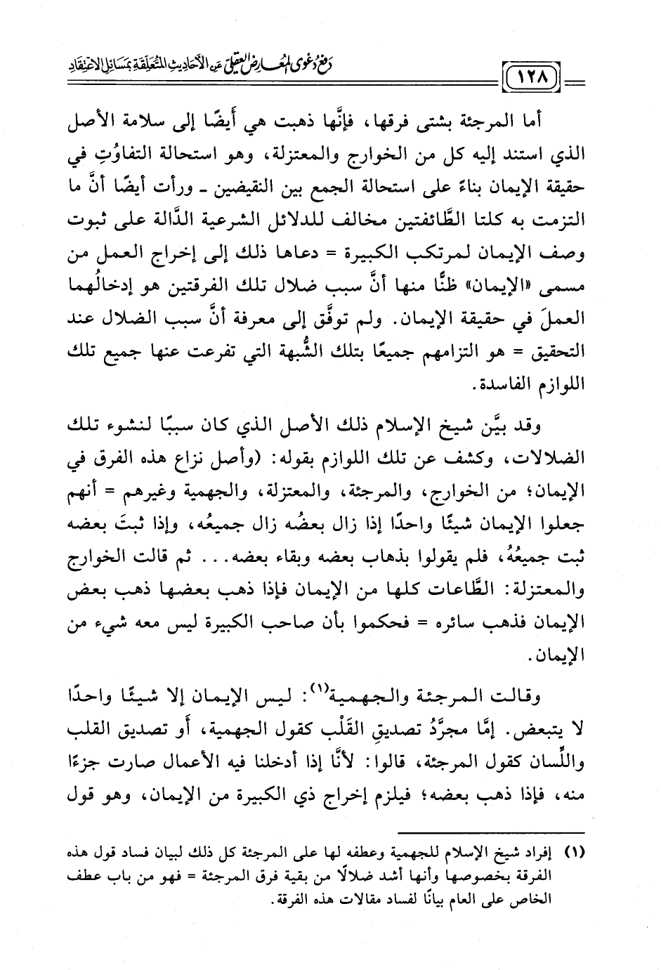 (¬١) إفراد شيخ الإسلام للجهميةوعطفه لها على المرجئة كل ذلك لبيان فساد قول هذه الفرقة بخصوصها وأنها أشد ضلالا من بقية فرق المرجئة =فهو من باب عطف الخاص على العام بيانًا لفساد مقالات هذه الفرقة