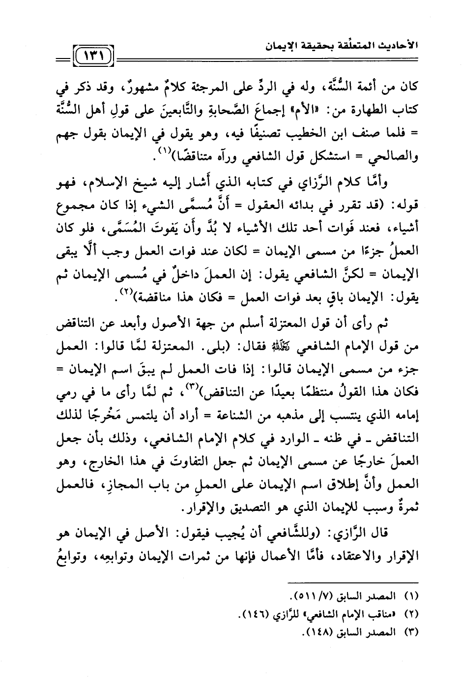 قال الرّازي: (وللشَّافعي أن يُجيب فيقول: الأصل في الإيمان هو الإقرار والاعتقاد فأمَّا الأعمال فإنها من ثمرات الإيمان، وتوابعه، وتوابع