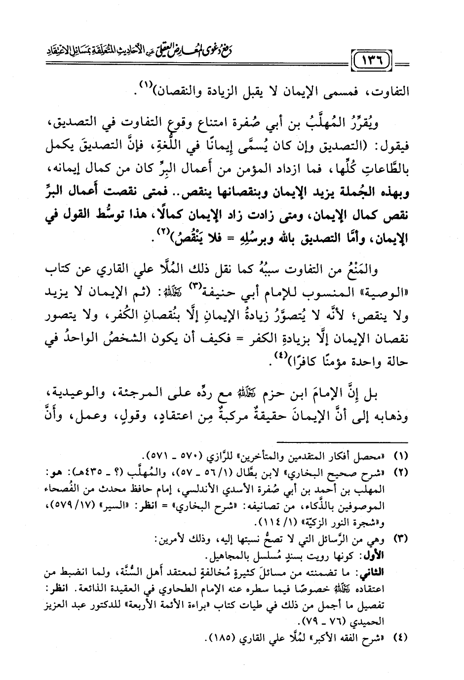 ويُقرّرُ المُهلَّبُ بن أَبي صُفرة امتناع وقوع التفاوت في التصديق، فيقول: (التصديق وإن كان يُسمّى إِيمانًا في اللُّغةِ، فإنَّ التصديقَ يكمل بالطَّاعاتِ كُلِّها، فما ازداد المؤمن من أَعمال البِرِّ كان من كمال إيمانه، وبهذه الجُملة يزيد الإيمان وبنقصانها ينقص. .فمتى نقصت أَعمال البرِّ نقص كمال الإيمان، ومتى زادت زاد الإيمان كمالًا، هذا توسُّط القول في الإيمان، وأمَّا التصديق بالله وبرسُلِهِ =فلا يَنْقُصُ) (¬٢)