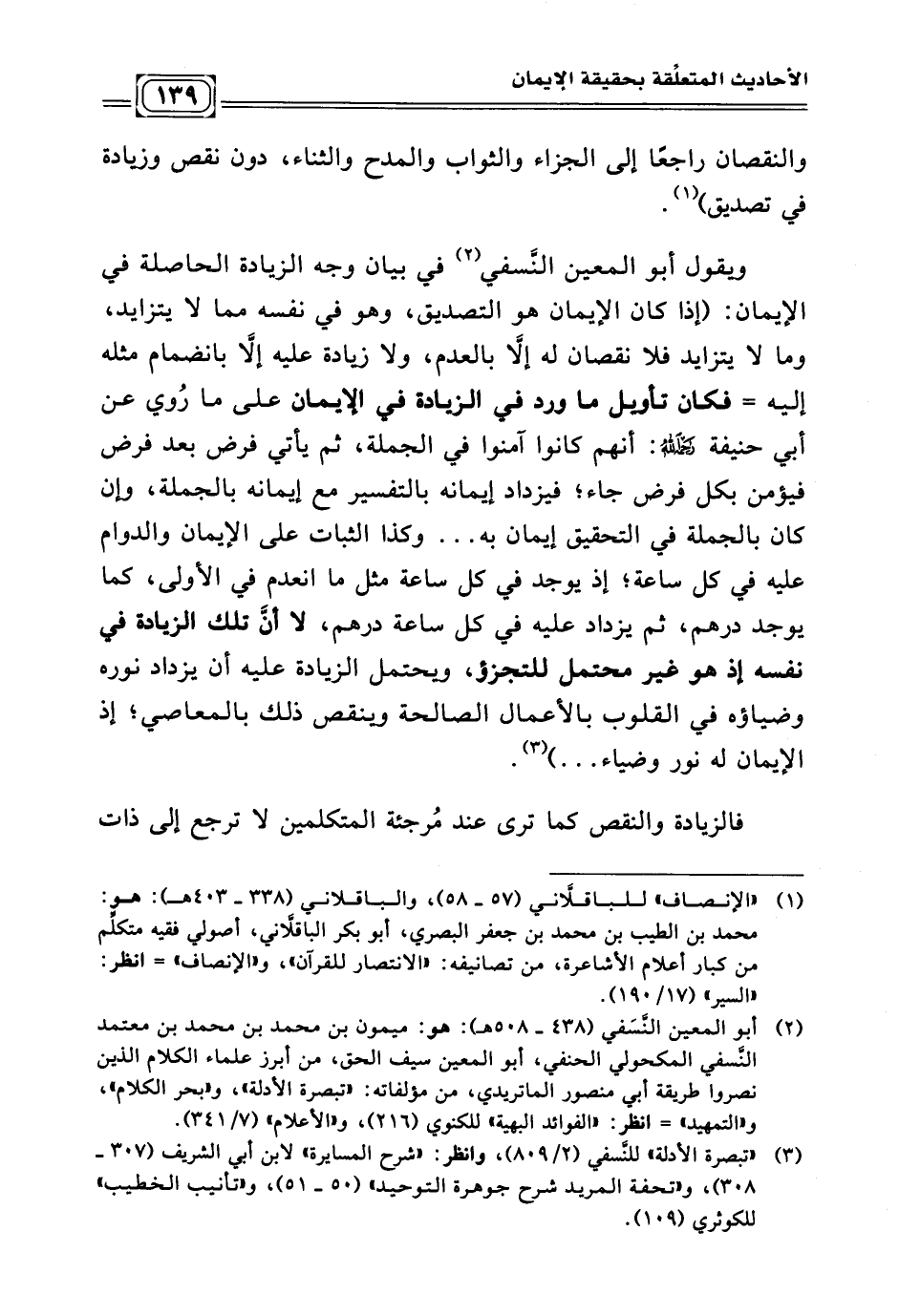 ويقول أبو المعين النَّسفي (¬٢) في بيان وجه الزيادة الحاصلة في الإيمان: (إذا كان الإيمان هو التصديق، وهو في نفسه مما لا يتزايد، وما لا يتزايد فلا نقصان له إلَاّ بالعدم، ولا زيادة عليه إلاّ بانضمام مثله إليه =فكان تأويل ماورد في الزيادة في الإيمان على مارُوي عن أبي حنيفة -رحمه الله- أنهم كانوا آمنوا في الجملة، ثم يأتي فرض بعد فرض فيؤمن بكل فرض جاء؛ فيزداد إيمانه بالتفسير مع إيمانه بالجملة، وإن كان بالجملة في التحقيق إيمان به. . . وكذا الثبات على الإيمان والدوام عليه في كل ساعة، إذ يوجد في كل ساعة مثل ما انعدم في الأولى، كما يوجد درهم، ثم يزداد عليه في كل ساعة درهم، لا أنَّ تلك الزيادة في نفسه إذ هو غيرمحتمل للتجزؤ، ويحتمل الزيادة عليه أن يزداد نوره وضياؤه في القلوب بالأعمال الصالحة وينقص ذلك بالمعاصي إذ الإيمان له نور وضياء ... ) (¬٣)