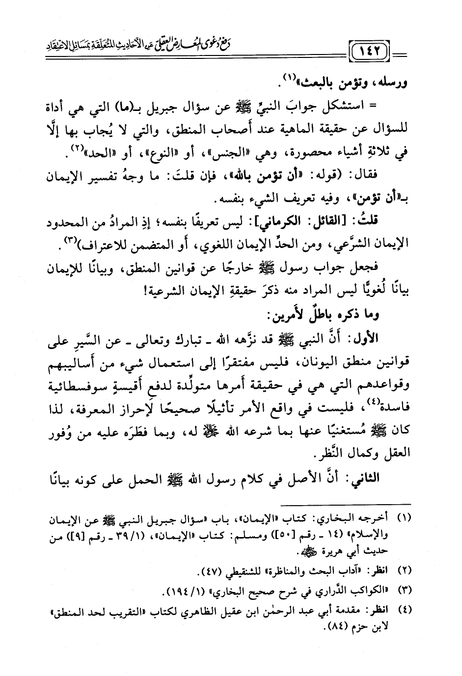 فجعل جواب رسول - صلى الله عليه وسلم - خارجًا عن قوانين المنطق، وبيانًا للإيمان بيانًا لُغويًا ليس المراد منه ذكرَ حقيقةِ الإيمان الشرعية!