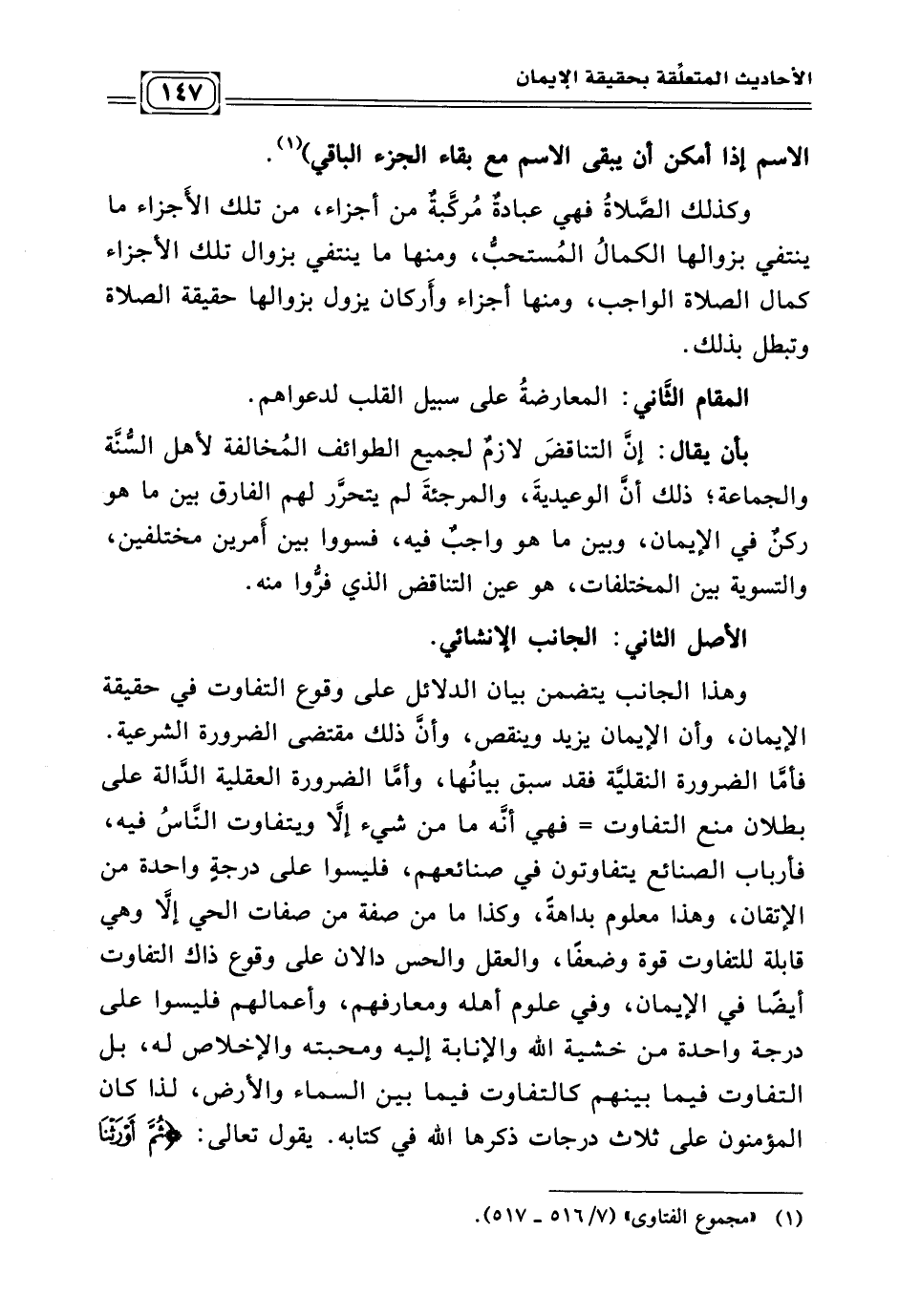 وهذا الجانب يتضمن بيان الدلائل على وقوع التفاوت في حقيقة الإيمان، وأن الإيمان يزيد وينقص، وأنَّ ذلك مقتضى الضرورة الشرعية. فأمَّا الضرورة النقليَّة فقد سبق بيانُها، وأمَّا الضرورة العقلية الدّالة على بطلان منع التفاوت =فهي أنّه ما من شيء إلاّ و يتفاوت النَّاسُ فيه، فأرباب الصنائع يتفاوتون في صنائعهم، فليسوا على درجةٍ واحدة من الإتقان، وهذا معلوم بداهةً، وكذا ما من صفة من صفات الحي إلاّ وهي قابلة للتفاوت قوة وضعفا، والعقل والحس دالان على وقوع ذاك التفاوت أيضا في الإيمان، وفي علوم أهله ومعارفهم، وأعمالهم فليسوا على درجة واحدة من خشية الله والإنابة إليه ومحبته والإخلاص له بل التفاوت فيما بينهم كالتفاوت فيما بين السماء والأرض، لذا كان المؤمنون على ثلاث درجات ذكرها الله في كتابه. يقول تعالى: {ثُمَّ أَوْرَثْنَا