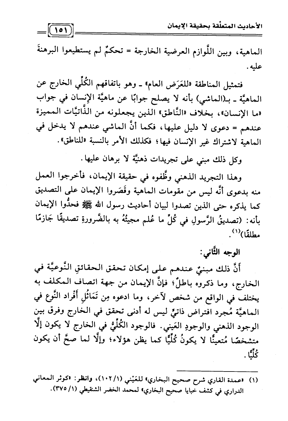 وهذا التجريد الذهني وظّفوه على حقيقة الإيمان، فأخرجوا العمل منه بدعوى أنَّه ليس من مقومات الماهية وقَصَروا الإيمان على التصديق كما يذكره حتى الذين تصدوا لبيان أحاديث رسول الله - صلى الله عليه وسلم - فحدّوا الإيمان بأنه: (تصديقُ الرَّسولِ في كُلِّ ما عُلم مجيئُهُ به بالضَّرورةِ تصديقًا جَازمًا مطلقًا (¬١)