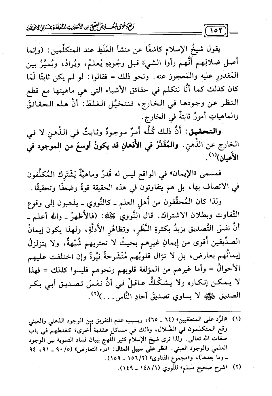 ولذا كان المُحقِّقون من أَهلِ العلم -كالنَّووي - يذهبون إلى وقوع التَّفاوت وبطلان الاشتراك. قال النَّووي - رحمه الله -: (فالأَظهرُ -والله أعلم- أنَّ نفسَ التَّصديق يزيدُ بكثرةِ النَّظَرِ، وتظاهُرِ الأَدلَّةِ، ولهذا يكون إيمانُ الصدّيقين أَقوى من إِيمانِ غيرِهم بحيثُ لا تعتريهم شُبْهةٌ، ولا يتزلزلُ إيمانُهم بعارض، بل لاتزال قلوبُهم مُنْشَرحةً نيَّرةً وإن اختلفت عليهم الأحوالُ=وأما غيرهم من المؤلفة قلوبهم ونحوهم فليسوا كذلك= فهذا لا يمكن إنكاره ولا يشككُّ عاقلٌ في أنّ نفسَ تصديق أبي بكر الصديق - رضي الله عنه - لايساوي تصديقَ آحادِ النَّاس ... ) (¬٢)