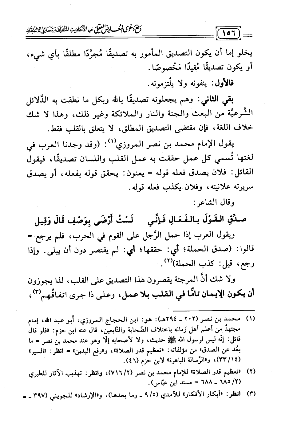 يقول الإمام محمد بن نصر المروزي (¬١): (وقد وجدنا العرب في لغتها تُسمي كل عمل حققت به عمل القلب واللسان تصديقًا، فيقول القائل: فلان يصدق فعله قوله = يعنون: يحقق قوله بفعله، أو يصدق سريرته علانيته، وفلان يكذب فعله قوله.