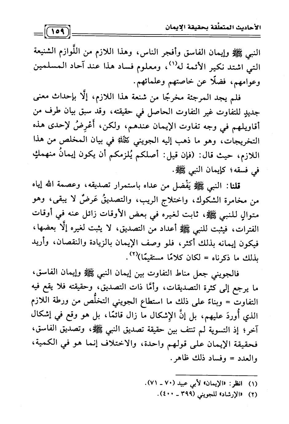 فالجويني جعل مناط التفاوت بين إيمان النبي - صلى الله عليه وسلم - وإيمان الفاسق، ما يرجع إلى كثرة التصديقات، وأمَّا ذات التصديق، وحقيقته فلا يقع فيه التفاوت= وبناءً على ذلك ما استطاع الجويني التخلُّص من ورطة اللازم الذي أُوردَ عليهم، بل إنَّ الإِشكال ما زال قائمًا بل هو وقع في إشكال آخر، إذ التسوية لم تنتف بين حقيقة تصديق النبي - صلى الله عليه وسلم -، وتصديق الفاسق، فحقيقة الإيمان على قولهم واحدة، والاختلاف إنما هو في الكمية، والعدد =وفساد ذلك ظاهر.