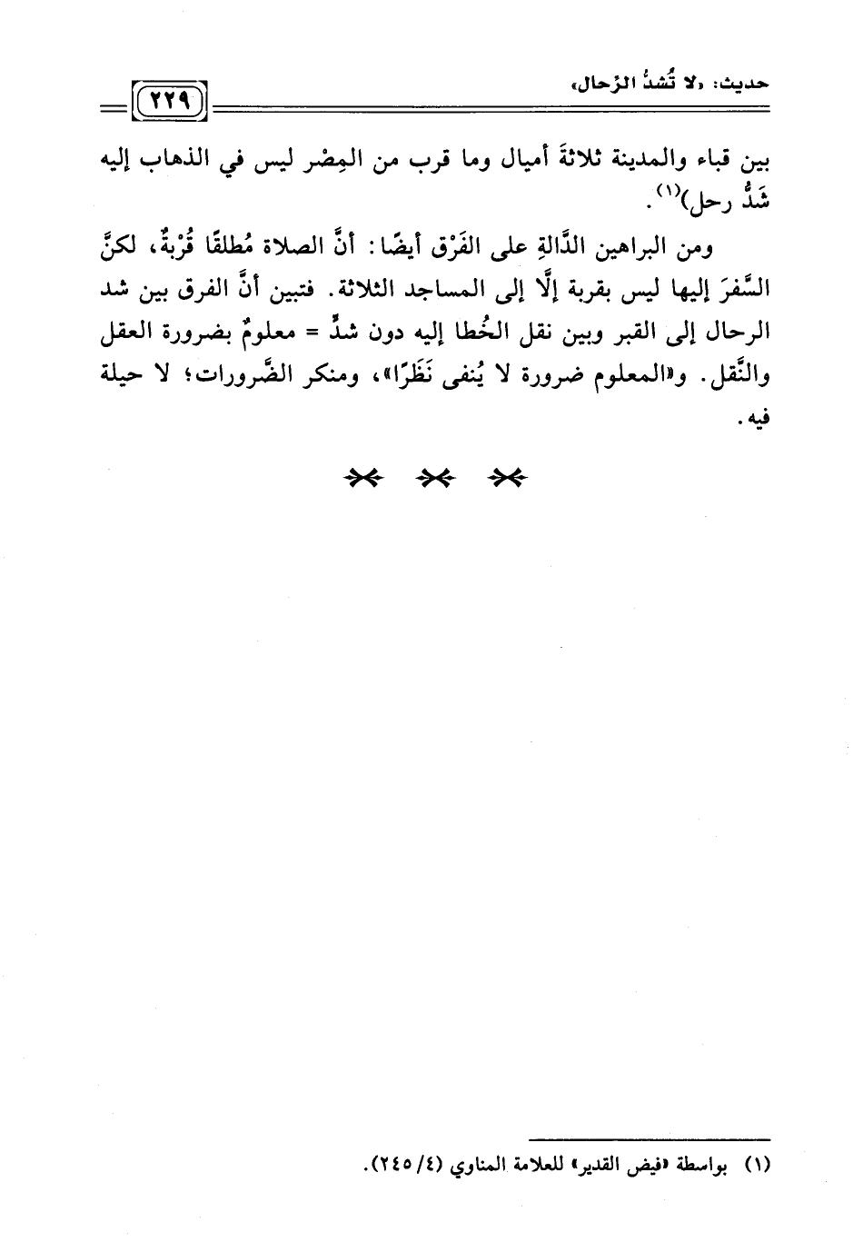 ومن البراهين الدَّالةِ على الفَرْق أيضًا: أنَّ الصلاة مُطلقًا قُرْبةٌ، لكنَّ السَّفرَ إليها ليس بقربة إلَّا إلى المساجد الثلاثة. فتبين أنَّ الفرق بين شد الرحال إلى القبر وبين نقل الخُطا إليه دون شدٍّ = معلومٌ بضرورة العقل والنَّقل. و «المعلوم ضَّرورة لا يُنفى نَظَرًا» ومنكر الضَّرورات؛ لا حيلة فيه.