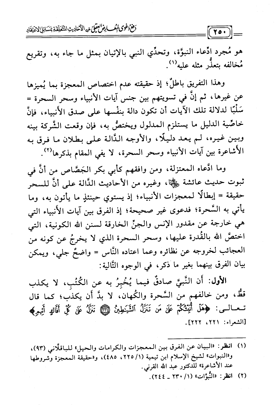 وهذا التفريق باطلٌ؛ إذ حقيقته عدم اختصاص المعجزة بما يُميزها عن غيرها، ثم إنّ في تسويتهم بين جنس آيات الأنبياء وسحر السحرة= سْلبٌ لدلالة تلك الآيات أن تكون دالة بنفْسها على صدق الأَنبياء، فإنّ خاصّية الدليل ما يستلزم المدلول ويختصُّ به، فإن وقعت الشَّركة بينه وبين غيره، لم يعد دليلًا، والأوجه الدّالة على بطلان ما فرق به الأَشاعرة بين آيات الأنبياء وسحر السحرة، لا يفي المقام بذكرها (¬٢) .
